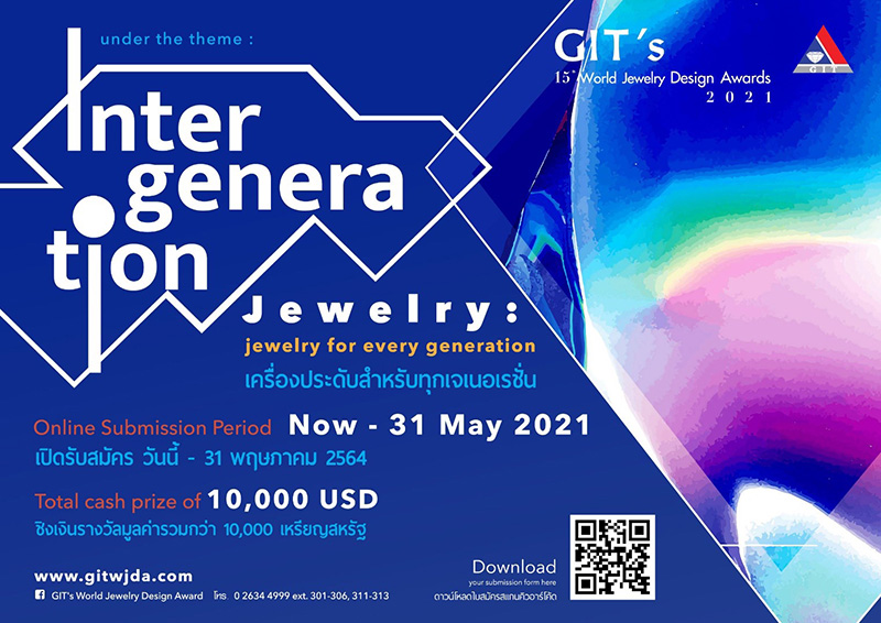 สถาบันวิจัยและพัฒนาอัญมณีและเครื่องประดับแห่งชาติ (องค์การมหาชน) หรือ GITชวนนักออกแบบไทย-เทศ ปลดปล่อยพลังความคิดสร้างสรรค์ ส่งผลงานออกแบบเครื่องประดับ ชิงรางวัล GIT’s World Jewelry Design Awards 2021 ภายใต้แนวคิด Intergeneration Jewelry ตอบโจทย์ผู้บริโภคยุค New Normal