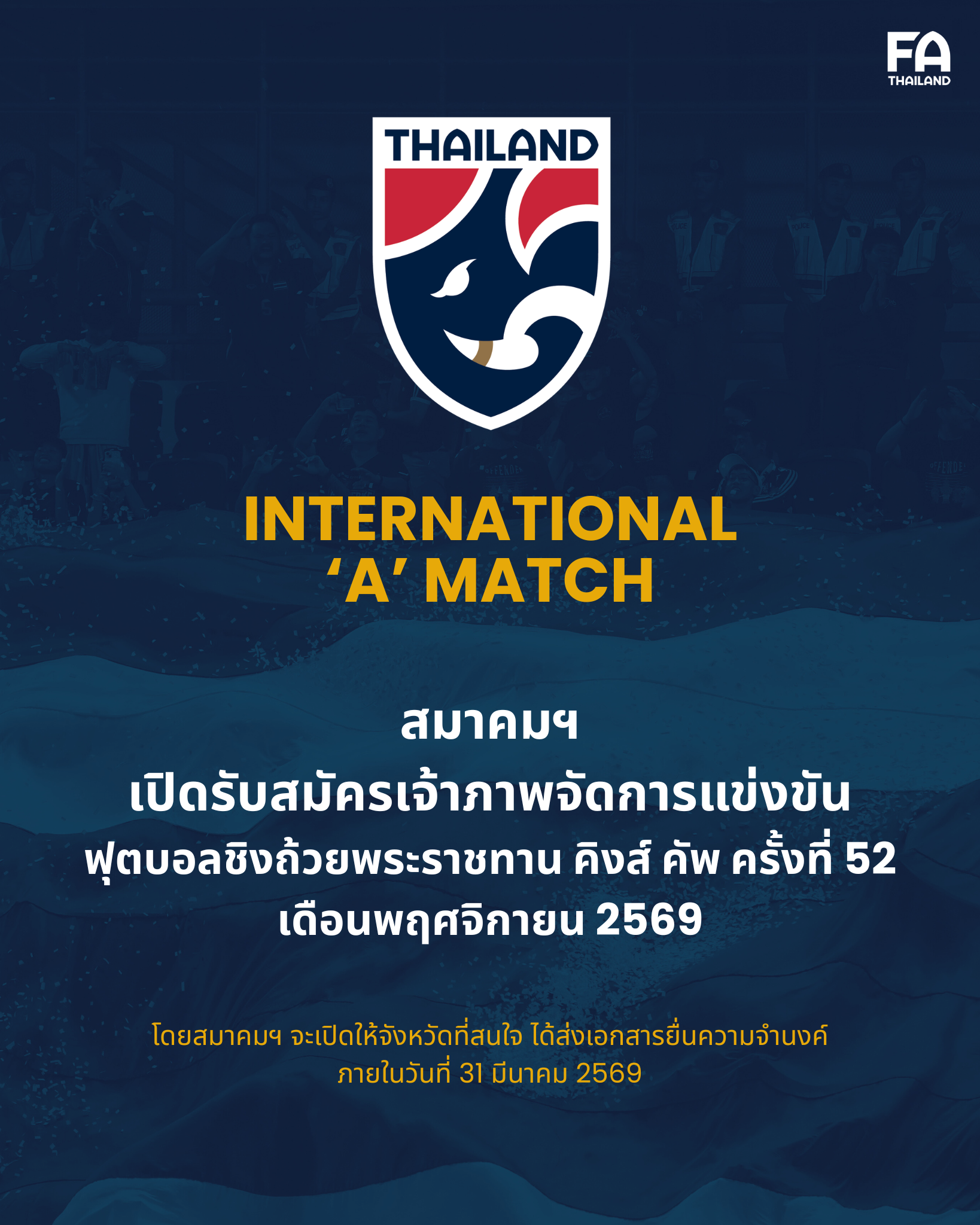 โดยสมาคมจะเปิดให้ จังหวัดที่สนใจ ส่งเอกสารยื่นความจำนงค์ได้ตั้งแต่บัดนี้ จนถึงวันที่ 31 มีนาคม 2569 โดยสามารถส่งหนังสือมายังสมาคมกีฬาฟุตบอลแห่งประเทศไทยฯ หรือ E-mail ได้ที่ [email protected]