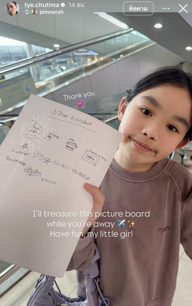 และอีกโมเมนต์ที่กินใจสุดๆ เมื่อ”น้องพิพิม“ ทำ picture board ให้คุณแม่ก่อนบิน โดยสาว “ต่าย” ก็ได้รีโพสต์ พร้อมเขียนแคปชั่นภาษาอังกฤษ “I’ll treasure this picture board while you’re away. Have fun, my little girl.” (แม่จะเก็บรักษากระดานรูปภาพนี้ไว้อย่างดีที่สุดในตอนที่หนูไม่อยู่ ขอให้สนุกนะจ๊ะ ลูกสาวตัวน้อยของแม่)