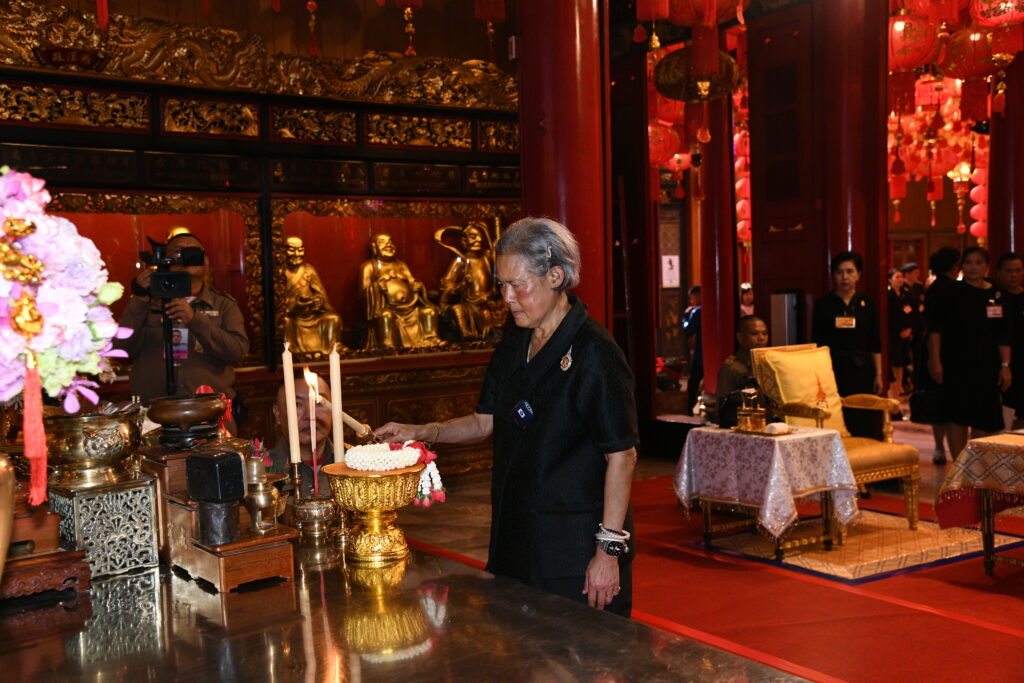 จากนั้น เสด็จ ฯ ไปยังวิหารเทพ ทรงถวายผลไม้มงคล ทรงวางพวงมาลัย ทรงจุดธูปเทือนเครื่องนมัสการที่นั่งบูชาเทพคุ้มครองดวงชะตา (ไทส่วยเอี้ย) เทวแพทย์ฮัวโต๋ (ฮั่วท้อ) และองค์เทพเจ้าโชคลาภ(ไฉ่ชิงเอี๊ย)