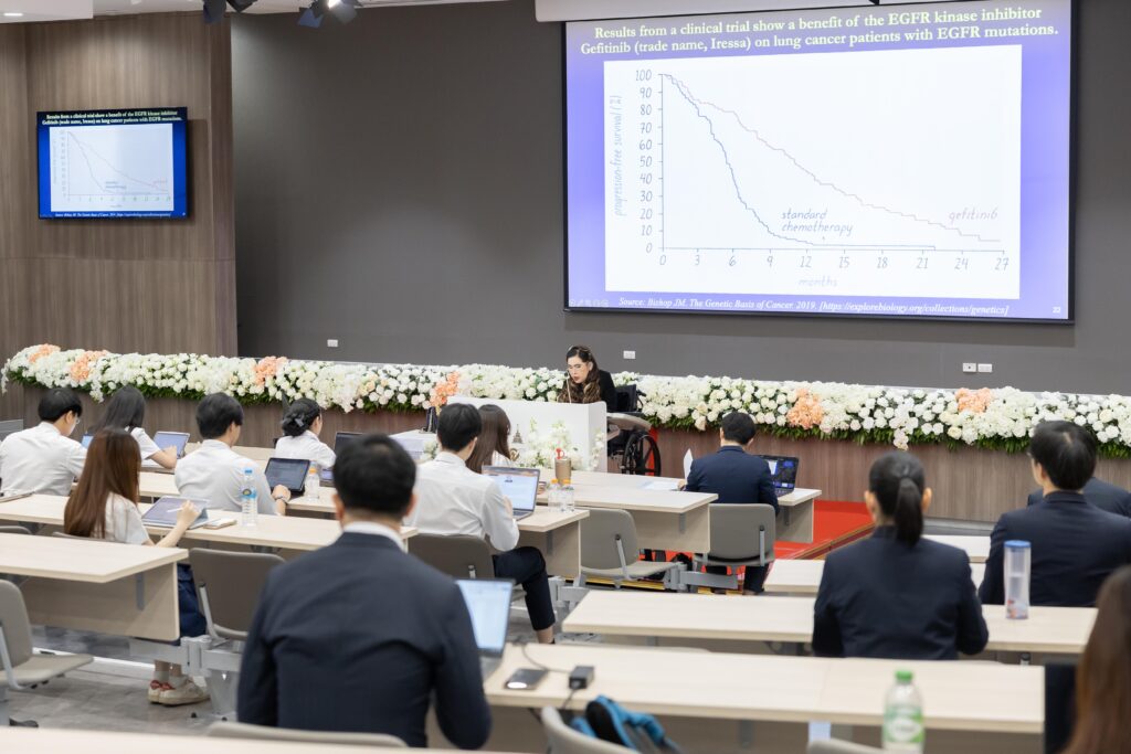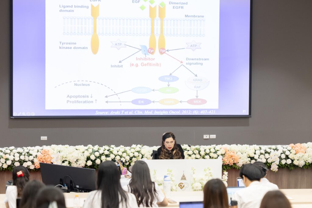 สำหรับครั้งนี้ ทรงบรรยาย ถึงการรักษาโรคมะเร็งที่กำลังก้าวเข้าสู่ยุคใหม่ ด้วยเทคโนโลยีทางชีวการแพทย์ที่ทันสมัย โดยเฉพาะการรักษาแบบ “เซลล์บำบัด” หรือ Cell Therapy เช่น การนำเซลล์ภูมิคุ้มกันของผู้ป่วยมาปรับแต่งพันธุกรรมให้สามารถจดจำและทำลายเซลล์มะเร็งได้ดีขึ้น ซึ่งเรียกกันว่า CAR T-cell therapy ปัจจุบัน ได้รับการยอมรับว่ามีประสิทธิภาพสูงในการรักษามะเร็งของระบบเลือดบางชนิด เช่น มะเร็งเม็ดเลือดขาวและมะเร็งต่อมน้ำเหลือง โดยเฉพาะในผู้ป่วยที่ดื้อต่อการรักษาในวิธีแบบมาตรฐาน อย่างไรก็ตาม การรักษาด้วยวิธีนี้อาจทำให้เกิดผลข้างเคียงที่รุนแรงได้ เช่น ภาวะการอักเสบทั่วร่างกายจากภูมิคุ้มกันทำงานมากเกินไป และภาวะแทรกซ้อนทางระบบประสาท จึงจำเป็นต้องดูแลอย่างใกล้ชิดในโรงพยาบาลเฉพาะทาง รวมถึงมีค่าใช้จ่ายในการรักษาสูง เนื่องจากกระบวนการผลิตเซลล์ต้องทำเฉพาะบุคคล ภายใต้มาตรฐานความปลอดภัยระดับสูง และต้องมีทีมแพทย์ผู้เชี่ยวชาญดูแลอย่างใกล้ชิด