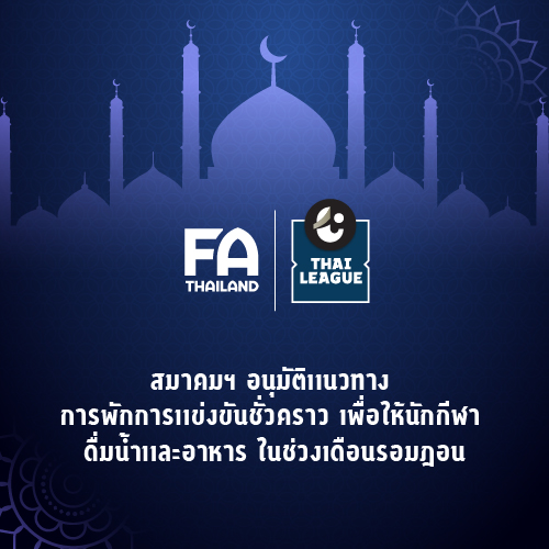 สมาคมกีฬาฟุตบอลแห่งประเทศไทยฯ อนุมัติให้ ฝ่ายจัดการแข่งขัน สามารถ พักเกมชั่วคราวเพื่อให้ผู้ที่นับถือศาสนาอิสลามได้ละศีลอด สามารถดื่มน้ำและอาหาร ในช่วงเดือนรอมฏอน สอดคล้องกับหลักปฏิบัติทางศาสนา ตลอดจนคำนึงถึงสุขภาพและสวัสดิภาพของนักกีฬา
