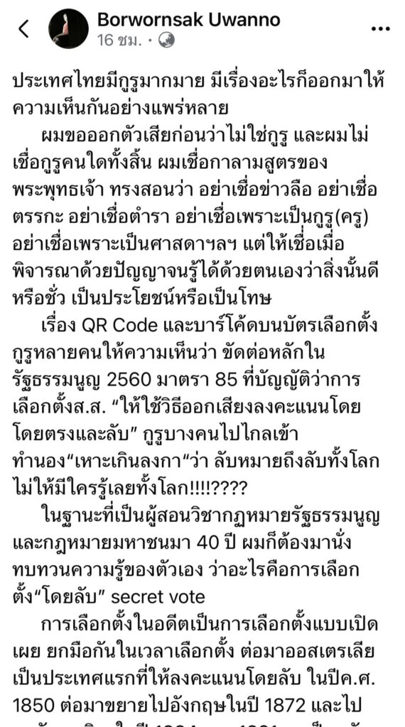 เรื่อง QR Code และบาร์โค้ดบนบัตรเลือกตั้ง กูรูหลายคนให้ความเห็นว่า ขัดต่อหลักในรัฐธรรมนูญ 2560 มาตรา 85 ที่บัญญัติว่าการเลือกตั้งส.ส. “ให้ใช้วิธีออกเสียงลงคะแนนโดยโดยตรงและลับ”กูรูบางคนไปไกลเข้าทำนอง “เหาะเกินลงกา”ว่า ลับหมายถึงลับทั้งโลก ไม่ให้มีใครรู้เลยทั้งโลก!!