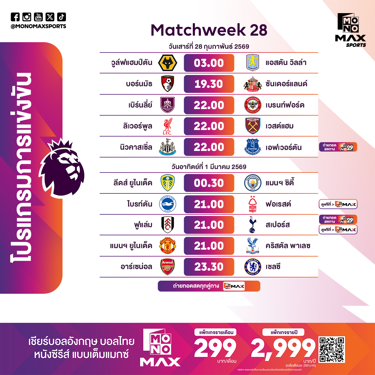เริ่มต้นวันเสาร์ที่ 28 กุมภาพันธ์ 2569 เวลา 03.00 น. (คืนวันศุกร์ที่ 27 กุมภาพันธ์ 2569) Monomax ถ่ายทอดสดดาร์บี้แห่งมิดแลนด์ เมื่อ วูล์ฟแฮมป์ตัน วันเดอเรอร์ส เปิดบ้านรับมือ แอสตัน วิลลา เกมแห่งศักดิ์ศรีที่มักเล่นกันด้วยความดุดัน จึงมีแนวโน้มเป็นเกมเปิดแลกตั้งแต่ต้น