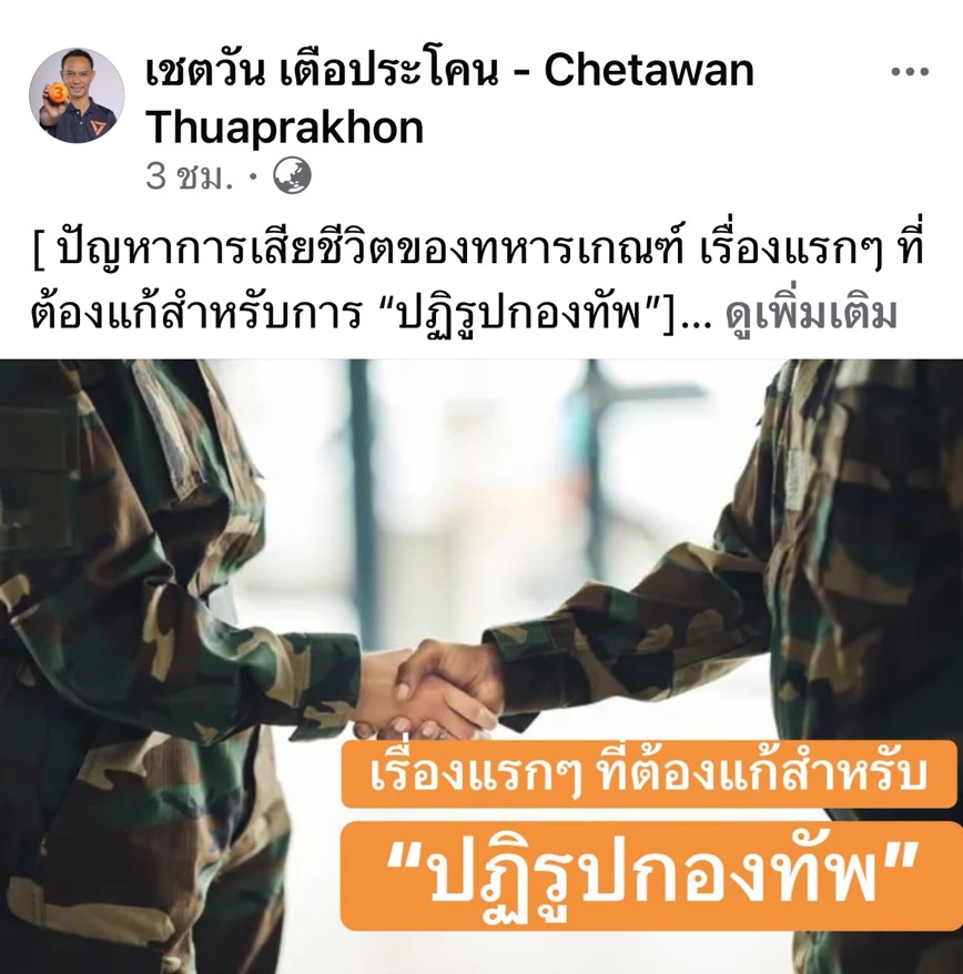 นายเชตวัน เตือประโคน ว่าที่ สส.พรรคประชาชน จ.ปทุมธานี โพสต์ข้อความผ่านเฟซบุ๊กต่อปัญหาการเสียชีวิตของทหารเกณฑ์ เรื่องแรกๆ ที่ต้องแก้สำหรับการ “ปฏิรูปกองทัพ”