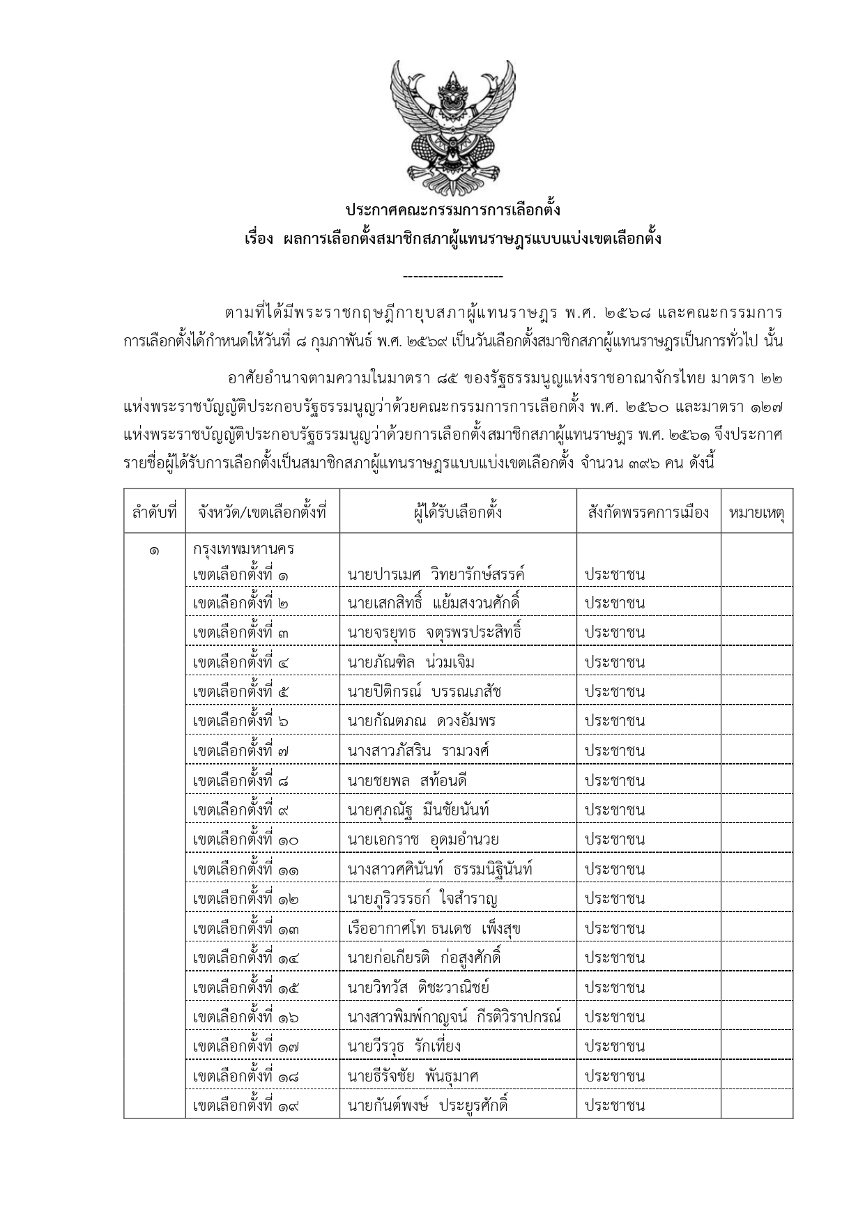 เป็นทางการ! กกต.ประกาศรับรองผลการเลือกตั้ง ส.ส.แบ่งเขต 396 คน