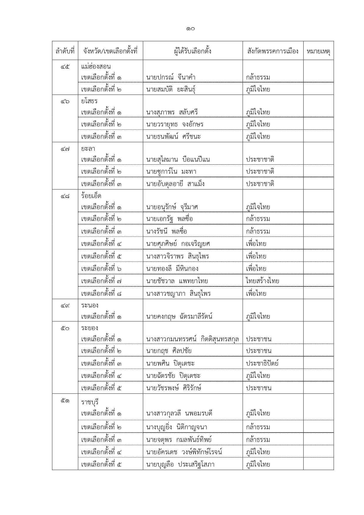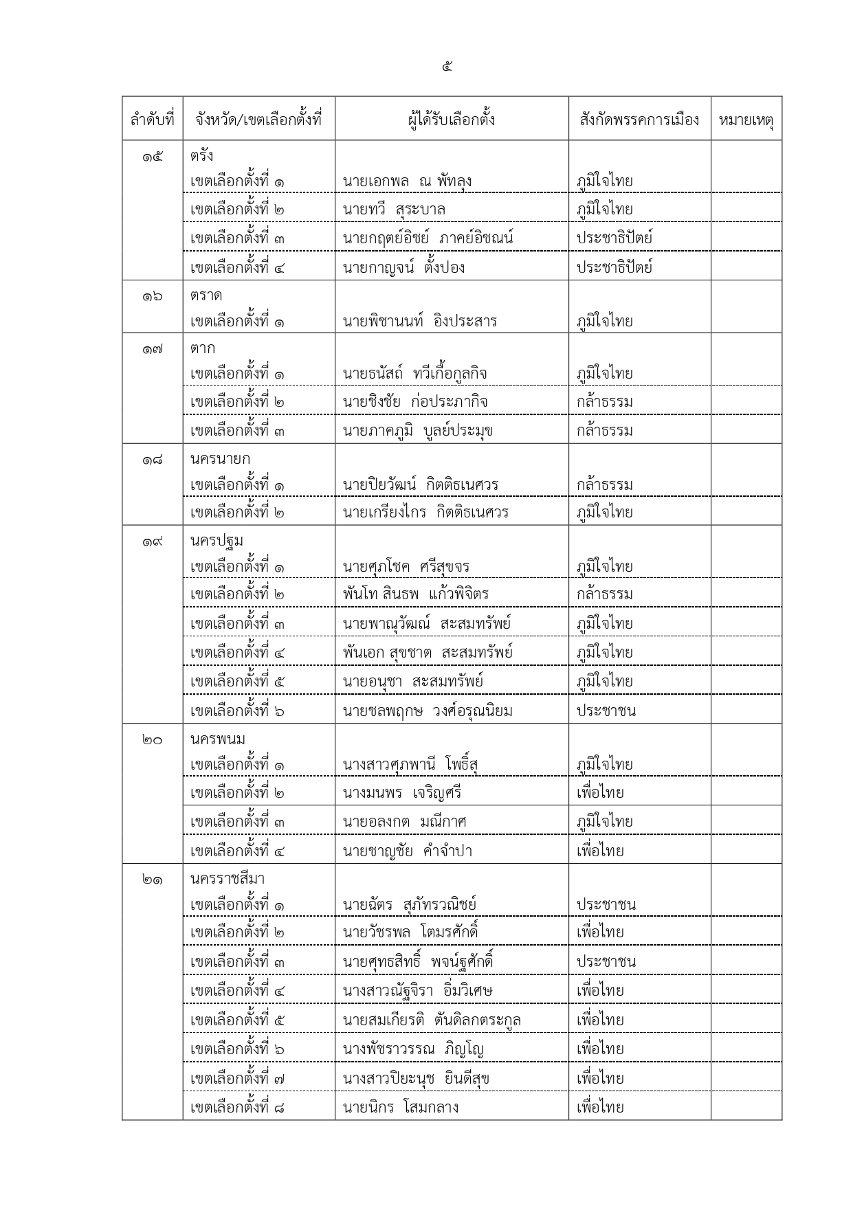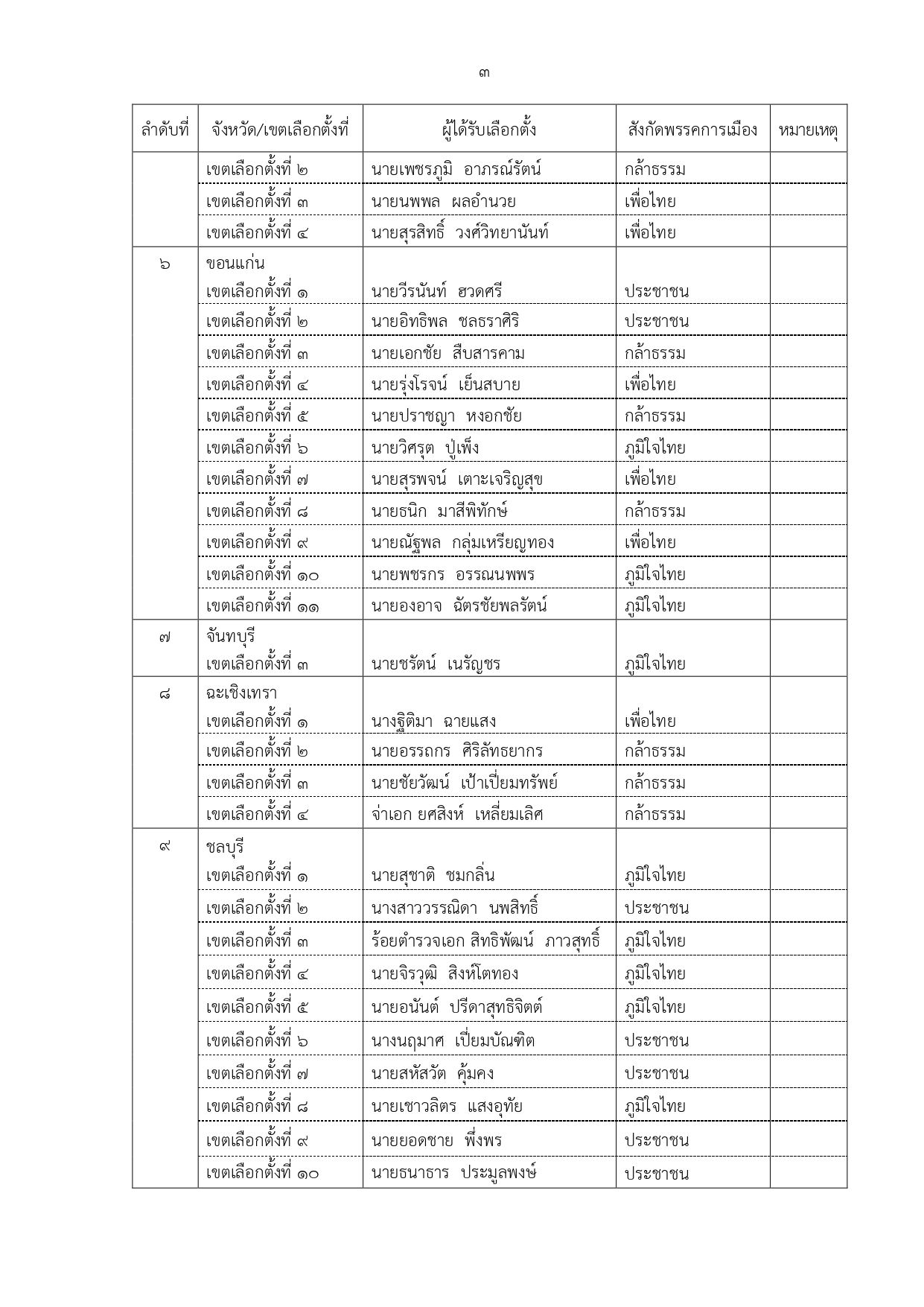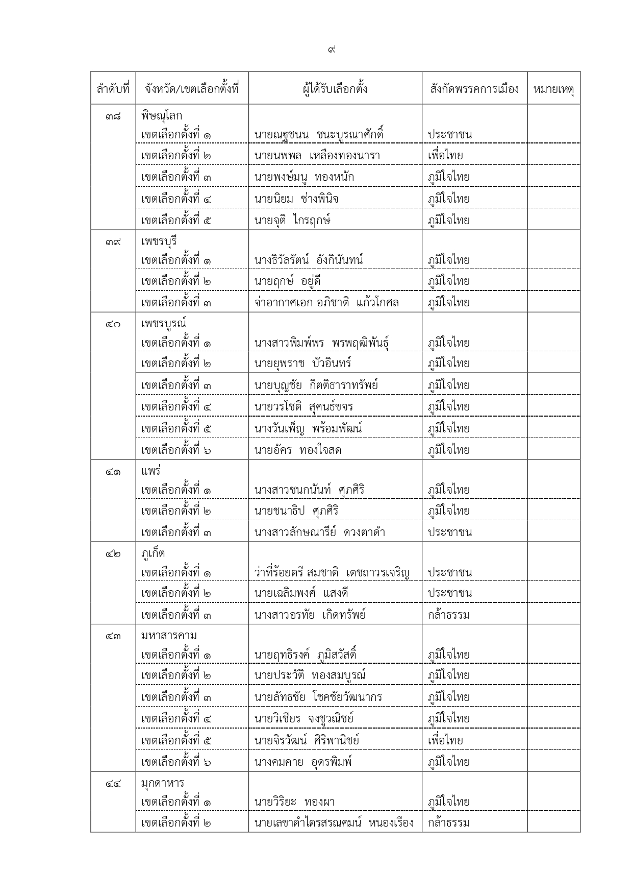 ทั้งนี้ การประกาศรายชื่อผู้ได้รับการเลือกตั้ง สส.บัญชีรายชื่อ และ สส.แบ่งเขตเลือกตั้ง ที่ยังไม่ประกาศ อยู่ระหว่างการพิจารณาของ กกต. โดย สส.แบ่งเขตเลือกตั้งที่ยังไม่ประกาศผลจำนวน 4 เขตเลือกตั้ง ได้แก่ สส.พะเยา เขต 1 สส.สุพรรณบุรี เขต 2 สส.จันทบุรี เขต 1 และ สส.จันทบุรี เขต 2 เนื่องจากอยู่ระหว่างการดำเนินการนับคะแนนใหม่ ตามมติ กกต.