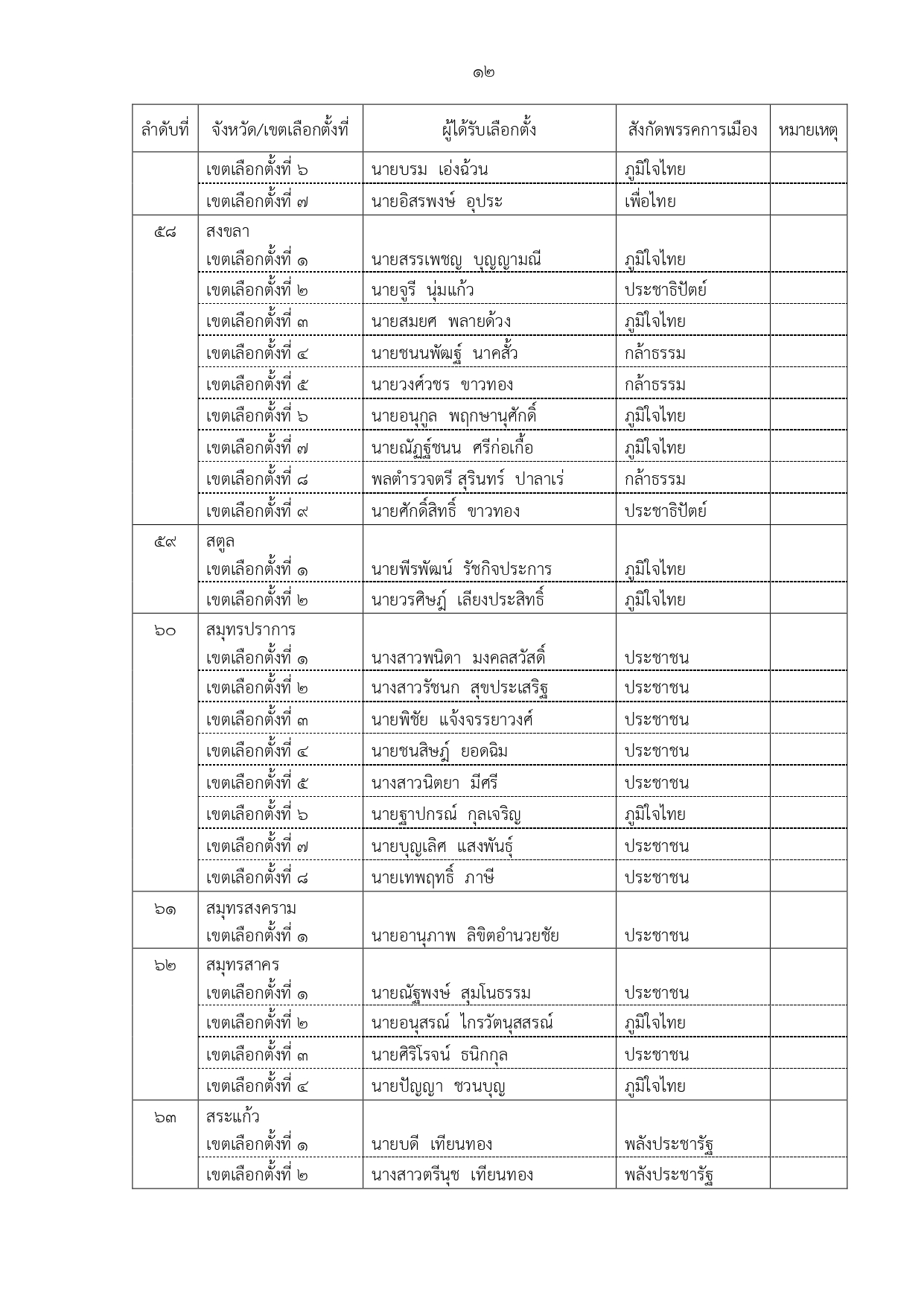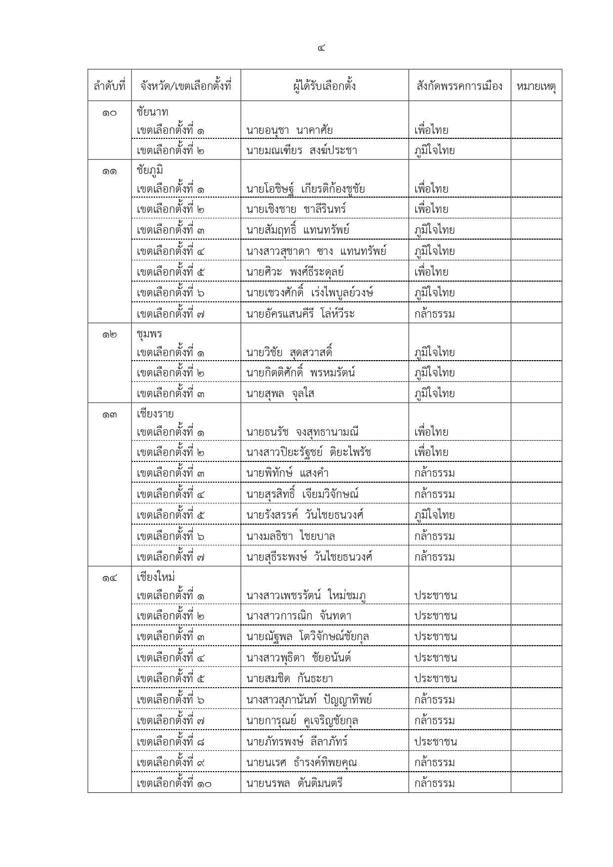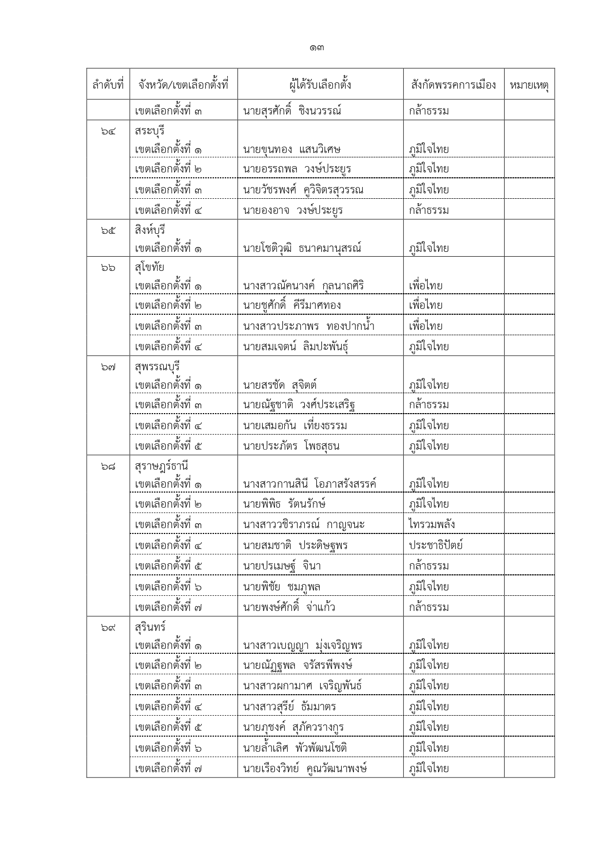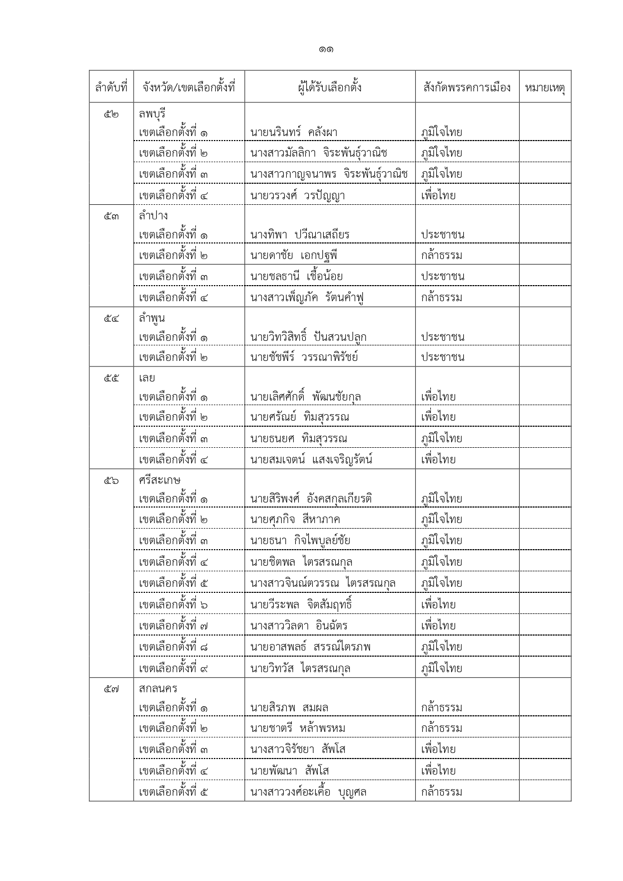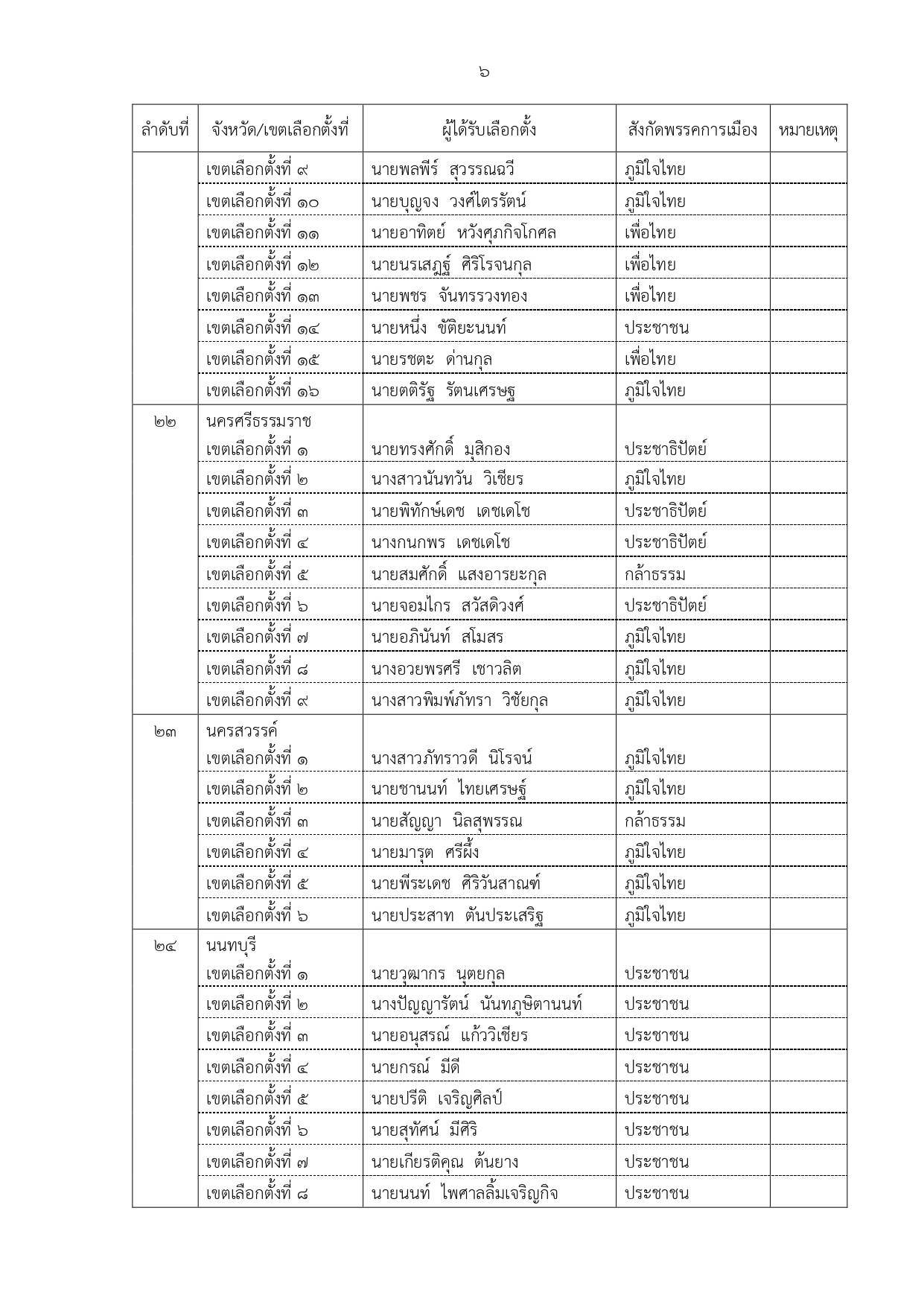 ทั้งนี้ การประกาศรายชื่อผู้ได้รับการเลือกตั้ง สส.บัญชีรายชื่อ และ สส.แบ่งเขตเลือกตั้ง ที่ยังไม่ประกาศ อยู่ระหว่างการพิจารณาของ กกต. โดย สส.แบ่งเขตเลือกตั้งที่ยังไม่ประกาศผลจำนวน 4 เขตเลือกตั้ง ได้แก่ สส.พะเยา เขต 1 สส.สุพรรณบุรี เขต 2 สส.จันทบุรี เขต 1 และ สส.จันทบุรี เขต 2 เนื่องจากอยู่ระหว่างการดำเนินการนับคะแนนใหม่ ตามมติ กกต.
