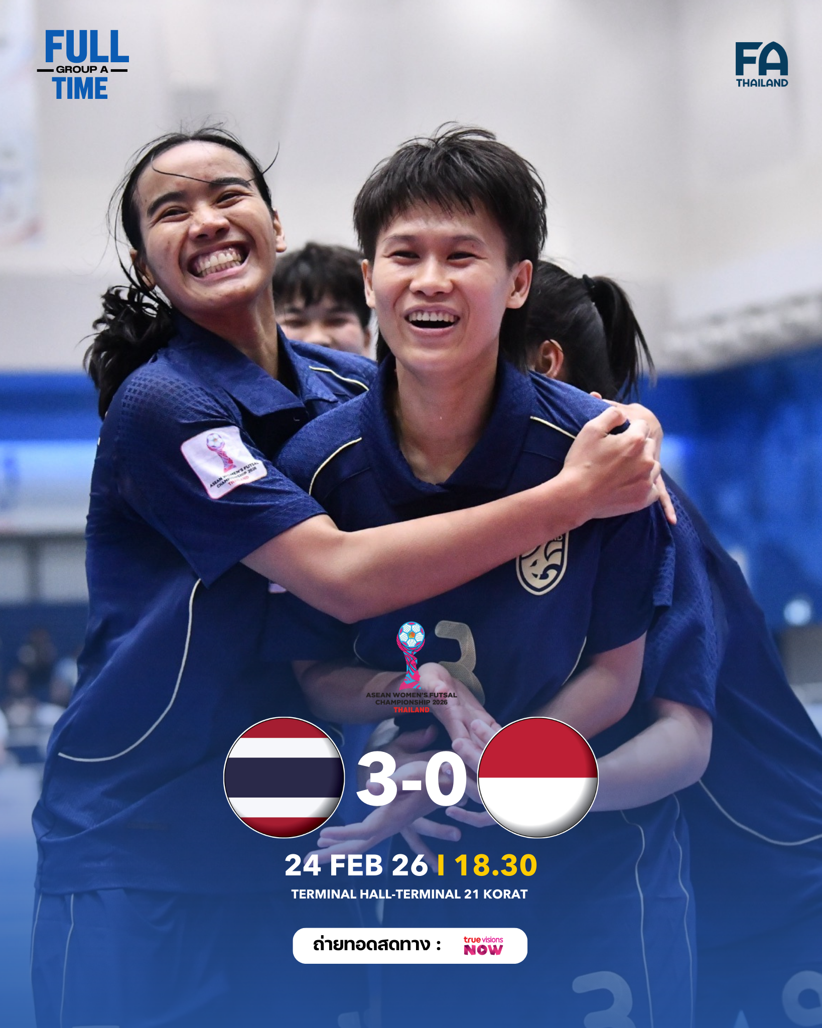วันที่ 24 กุมภาพันธ์ 2569 เวลา 18.30 น. ณ เทอร์มินอลฮอลล์ ศูนย์การค้าเทอร์มินอล 21 โคราช จ.นครราชสีมา การแข่งขันฟุตซอลหญิงชิงแชมป์อาเซียน รอบแบ่งกลุ่ม กลุ่มเอ นัดแรก ฟุตซอลหญิงทีมชาติไทย ทีมอันดับ 8 ของโลก ลงสนามพบกับ อินโดนีเซีย ทีมอันดับ 18 ของโลก