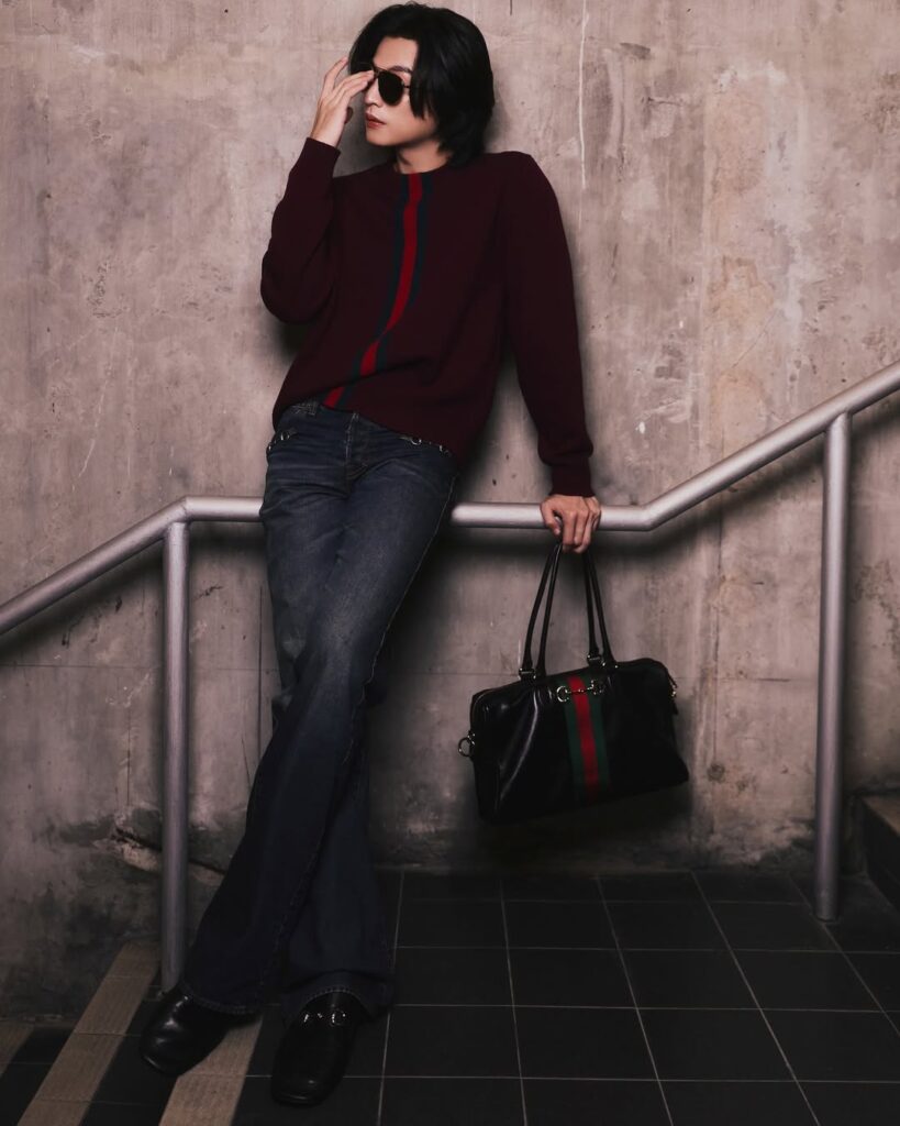 อินทาร์เซียแถบ Web สีเขียวและสีแดง จับคู่กับกางเกงผ้าฝ้ายเดนิมฟอกสีตกแต่งด้วยสัญลักษณ์ Horsebit จาก คอลเล็คชั่น Spring Summer 2026 เสริมลุคด้วยไอเท็มชิ้นเด่นกระเป๋ารุ่น Borsetto หนังนิ่มสีดำ โดดเด่นด้วยฮาร์ดแวร์รูปทรงตะขอปากม้าซึ่งเป็นรหัสสำคัญของแบรนด์ นำเสนอในซิลูเอตผ่อนคลายร่วมสมัย ปิดท้ายลุคด้วยรองเท้า Horsebit Loafer หนังสีดำ ดีไซน์โครงสร้างประณีตมอบความนุ่มสบายและยืดหยุ่นเป็นพิเศษ พร้อมแว่นกันแดดรูปทรง Aviator ถ่ายทอดเสน่ห์สมมง Brand Ambassador ตัวแทนหนึ่งเดียวจากประเทศไทยของ Gucci ได้อย่างสง่างาม