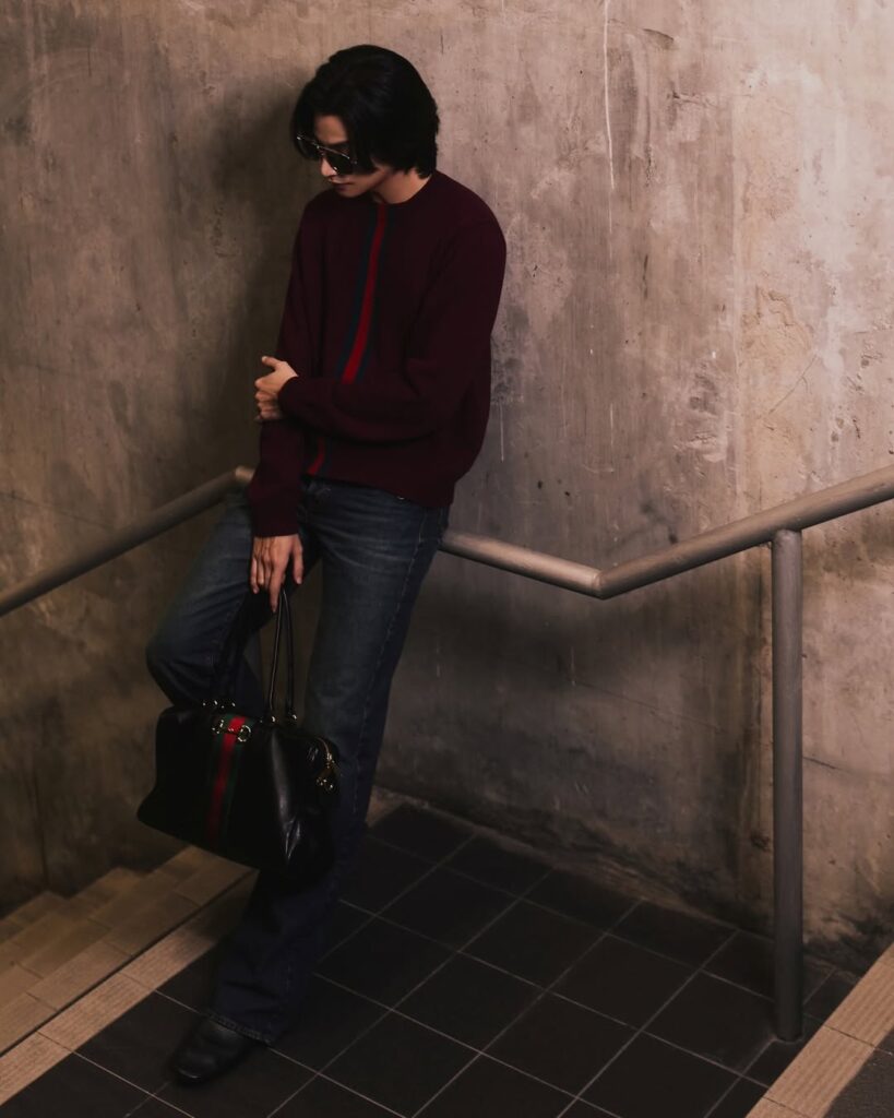 อินทาร์เซียแถบ Web สีเขียวและสีแดง จับคู่กับกางเกงผ้าฝ้ายเดนิมฟอกสีตกแต่งด้วยสัญลักษณ์ Horsebit จาก คอลเล็คชั่น Spring Summer 2026 เสริมลุคด้วยไอเท็มชิ้นเด่นกระเป๋ารุ่น Borsetto หนังนิ่มสีดำ โดดเด่นด้วยฮาร์ดแวร์รูปทรงตะขอปากม้าซึ่งเป็นรหัสสำคัญของแบรนด์ นำเสนอในซิลูเอตผ่อนคลายร่วมสมัย ปิดท้ายลุคด้วยรองเท้า Horsebit Loafer หนังสีดำ ดีไซน์โครงสร้างประณีตมอบความนุ่มสบายและยืดหยุ่นเป็นพิเศษ พร้อมแว่นกันแดดรูปทรง Aviator ถ่ายทอดเสน่ห์สมมง Brand Ambassador ตัวแทนหนึ่งเดียวจากประเทศไทยของ Gucci ได้อย่างสง่างาม