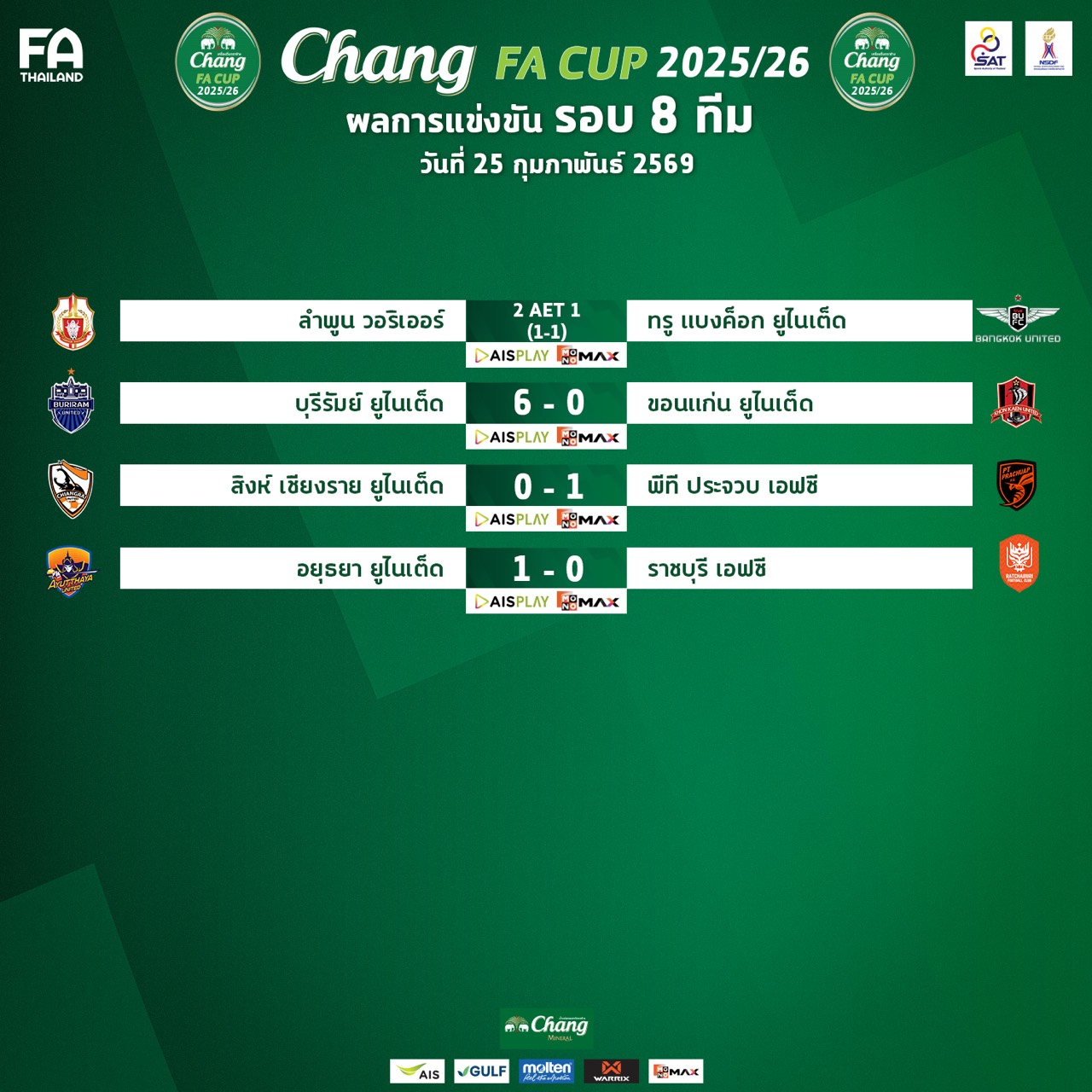 สรุปผลฟุตบอลถ้วย “ช้าง เอฟเอ คัพ” ฤดูกาล 2025/26 รอบ 8 ทีมสุดท้าย (วันที่ 25 กุมภาพันธ์ 2569)