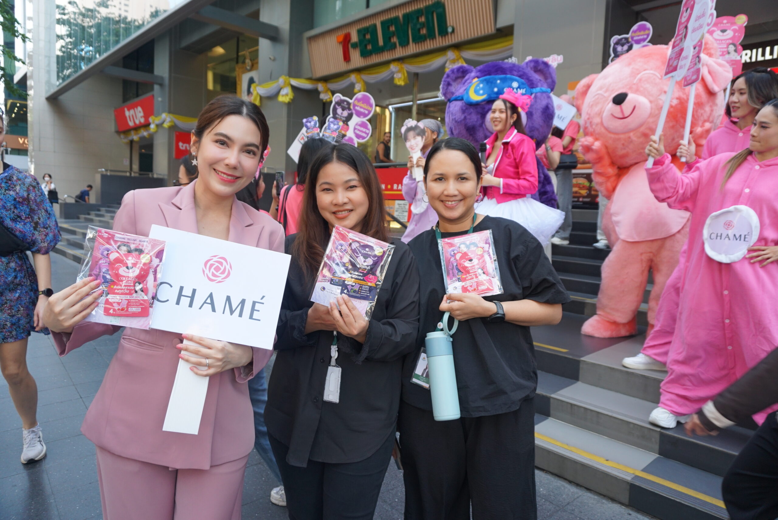 สำหรับกิจกรรม “CHAME’ GUMMY SERIES TROOP” สร้างสีสันคึกคักตลอดเส้นทาง Troop โดยมี คุณนันท์ฐณิชา ศิริปรีดาวัชร์ ประธานเจ้าหน้าที่บริหารและผู้ก่อตั้ง บริษัท ชาเม่ คอร์ปอเรชั่น จำกัด (มหาชน), คุณนิธิภัทร ศรกาญจน์ รองประธานเจ้าหน้าที่บริหาร และทีมงานชาเม่ ร่วมเดินแจกความสดใสให้กับชาวออฟฟิศ รวมถึงเข้าเยี่ยมชมและมอบผลิตภัณฑ์ถึงออฟฟิศ CP ส่งตรงกัมมี่ทั้ง 2 สูตรถึงมือผู้บริหารและพนักงาน ให้ได้สัมผัสประสบการณ์ “ตัวหอม ผิวใส หลับดี ผ่อนคลาย” อย่างใกล้ชิด นอกจากนั้น “ชาเม่” ยังสร้างสีสันต่อเนื่อง เมื่อ คุณนันท์ฐณิชา ศิริปรีดาวัชร์ และ คุณเชียร์ ฑิฆัมพร ฤทธิ์ธาอภินันท์ ได้เยี่ยมชมบูธ Beautrium ที่สยามสแควร์ ตอกย้ำภาพลักษณ์แบรนด์ที่เคลื่อนไหวตลอดเวลา และพร้อมเข้าถึงกลุ่มเป้าหมายในทุกไลฟ์สไตล์ฮับของกรุงเทพฯ อีกด้วย