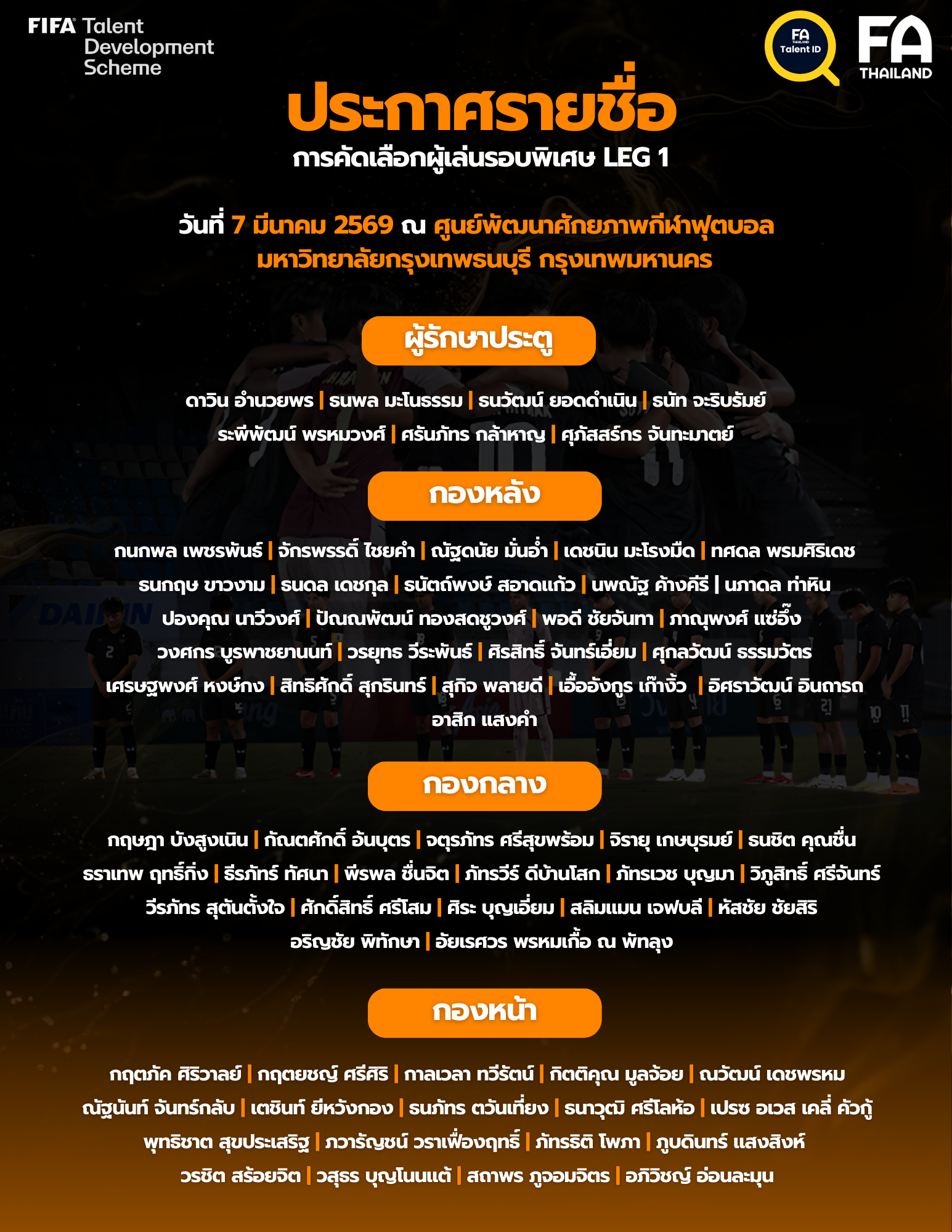 ประกาศรายชื่อ ผู้ที่ผ่านการคัดเลือกในโครงการ FIFA TDS Talent ID 2026 เลกแรก เพื่อเตรียมทีมชาติไทย U16
