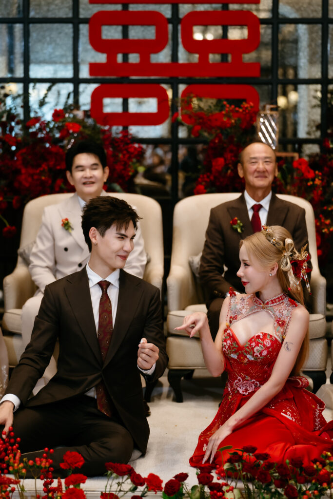 โดยช่วงบ่ายเวลา 13.59 น. ได้มีพิธีแห่ขันหมากและหมั้นแบบทางจีน ประกอบไปด้วยพิธีทานขนมอี๊ , พิธียกน้ำชา ถ่ายภาพรวมครอบครัวทั้งสองฝ่าย รวมไปถึงมีเพื่อนพ้องในวงการ อาทิ จันจิ จันจิรา , แกรนด์ กรณ์ภัสสร , เกรท สพล, ทับทิม อัญรินทร์ , ชอน ชวิศการ , ดรีม-ปุณณฤกษ์ ฯลฯ ร่วมแสดงความยินดี ซึ่งพิธีฉลองมงคลสมรสจะจัดช่วงค่ำในวันเดียวกัน