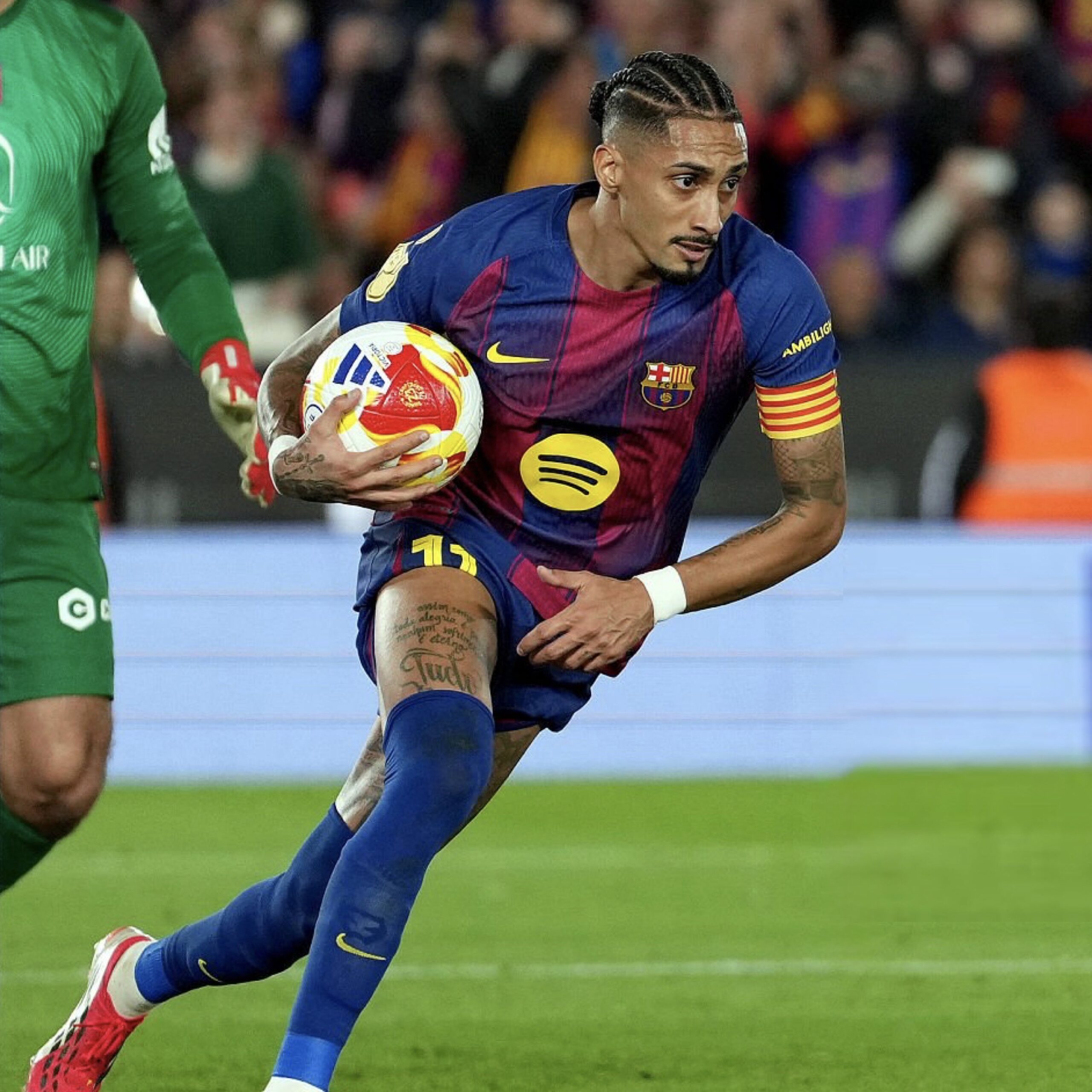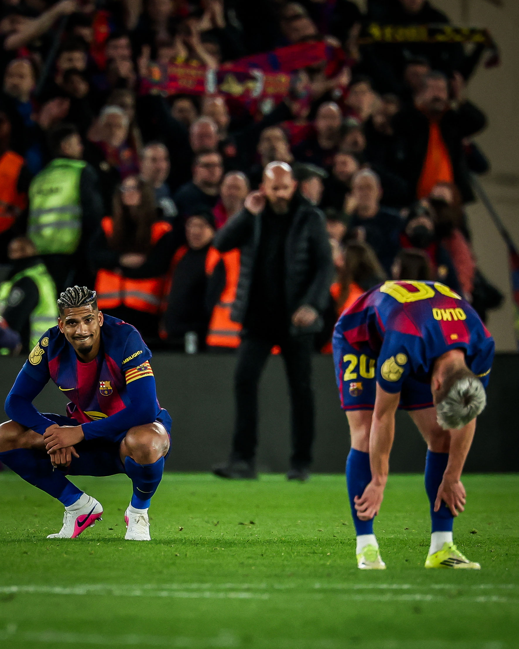 ผลปรากฏว่า แค่เริ่มเกมมา บาร์ซ่า ก็จำเป็นต้องเปลี่ยนตัวทันที หลัง คุนเด้ เจ็บแล้วเล่นต่อไม่ไหว ส่ง บัลเด้ ลงไปแทน พลางขยับ คันเซโล่ ยืนแบ็คขวาแทน นาที 29 บาร์ซ่า มาได้ประตูที่ต้องการจนได้ จากจังหวะเตะมุมเล่นกันสั้น เฟร์มิน แตะให้ ยามาล หลอกอย่างเนียนก่อนเปิดยัดให้ เบร์นาล วางเท้าแปโล่ง ๆ เข้าไป ตอนนี้สกอร์ตามหลัง 4-1 นาที 45+5 บาร์ซ่า มาได้จุดโทษก่อนหมดครึ่งแรก เปดรี้ โดน พูบิลล์ ดักขาล้มลง ผู้ตัดสินเป่าแบบไม่ลังเลเลย แล้วก็เป็น ราฟินญ่า ที่รับหน้าที่สังหารเข้าไปไม่พลาด มุสโซ่ พุ่งไปผิดทาง บาร์ซ่านำสองประตูแล้ว สกอร์รวมตามหลัง 4-2