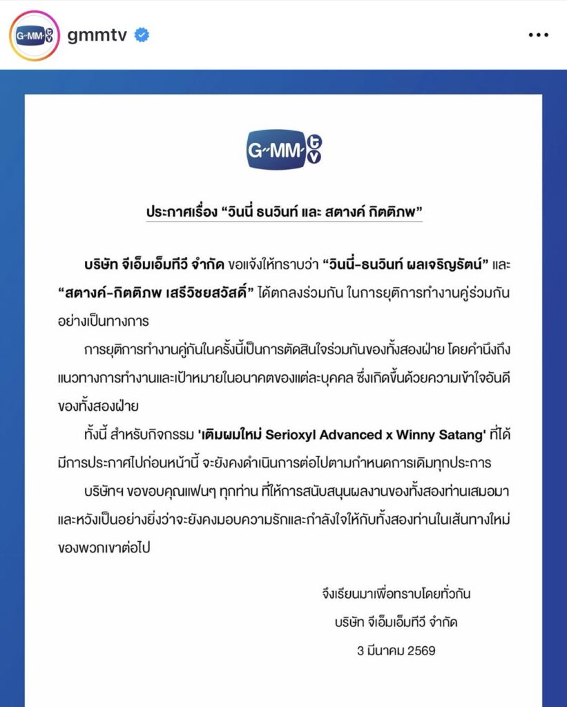 โดย”GMM TV” ได่ร่อนจดหมายประกาศว่า” บริษัท จีเอ็มเอ็มทีวี จำกัด ขอแจ้งให้ทราบว่า “วินนี่-ธนวินท์ ผลเจริญรัตน์” และ “สตางค์-กิตติภพ เสรีวิชยสวัสดิ์” ได้ตกลงร่วมกัน ในการยุติการทำงานคู่ร่วมกันอย่างเป็นทางการ