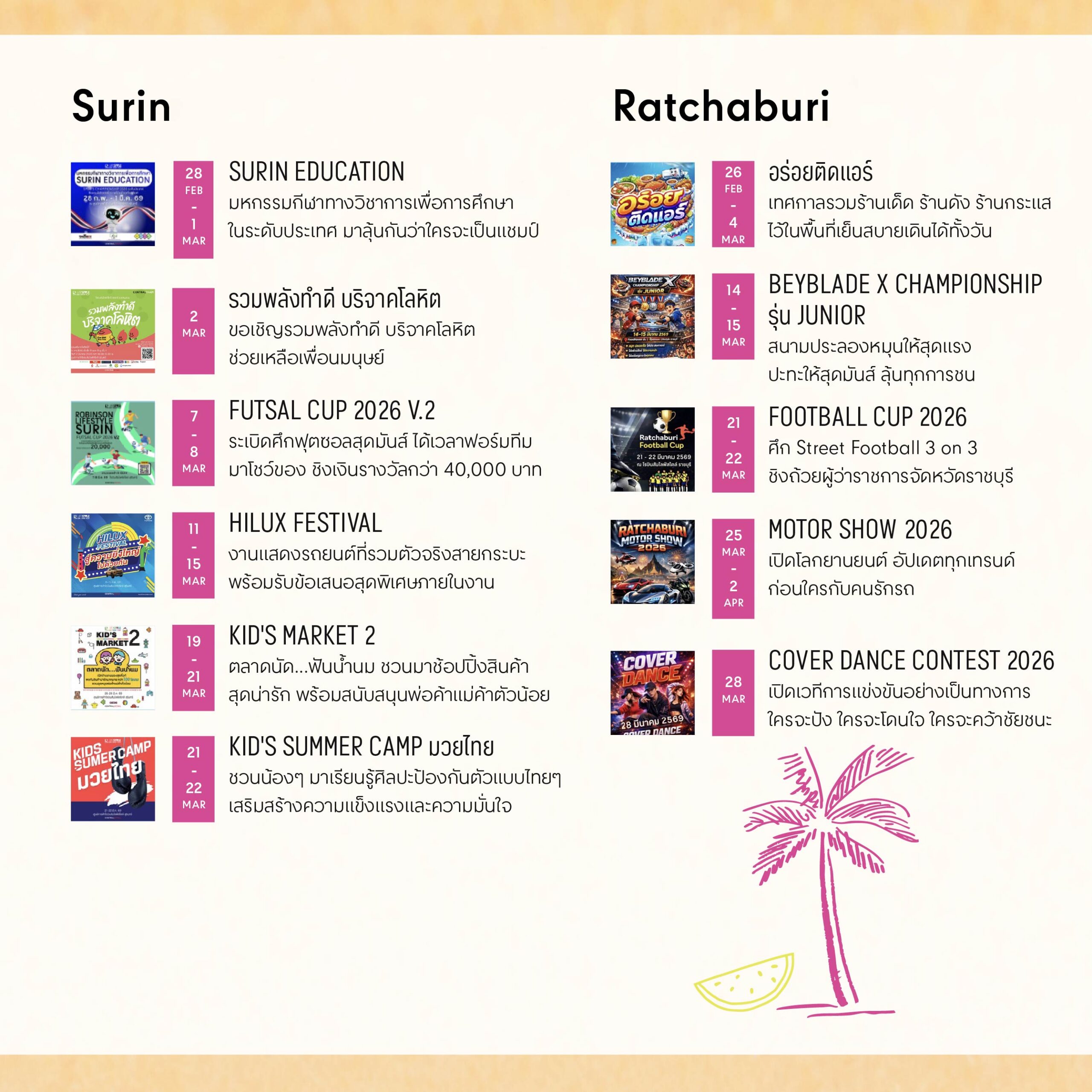 ทั้งอิเวนต์สุดฮอต เวทีการแข่งขันความสามารถหลากหลายรูปแบบ และเทศกาลอาหารสุดฟิน เปิดพื้นที่ให้ทุกครอบครัวออกมาใช้ชีวิต ปล่อยพลังความสดใส มีชีวิตชีวา และสร้างโมเมนต์รับซัมเมอร์ที่สนุกที่สุดของปีไปด้วยกัน ตลอดเดือนมี.ค. 69