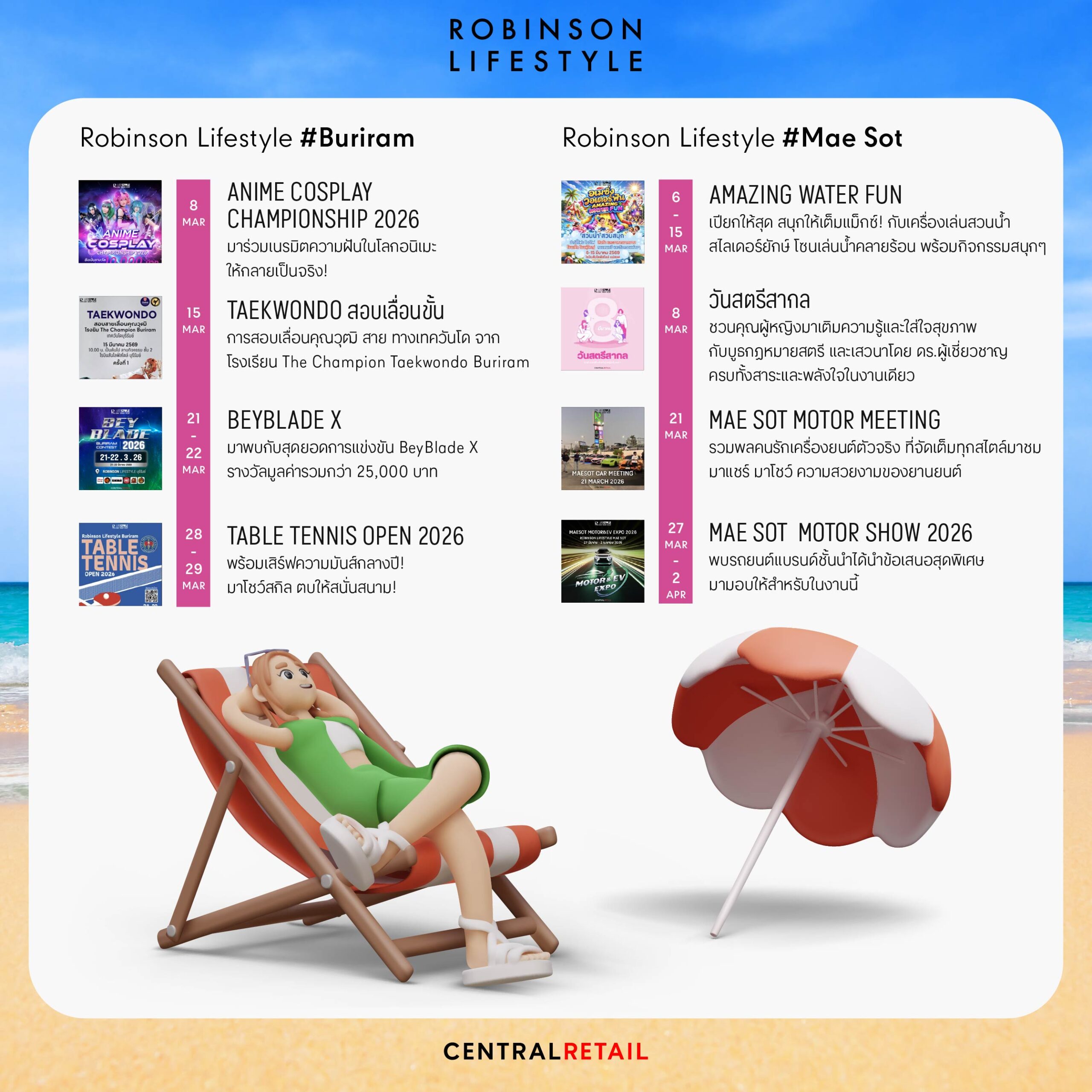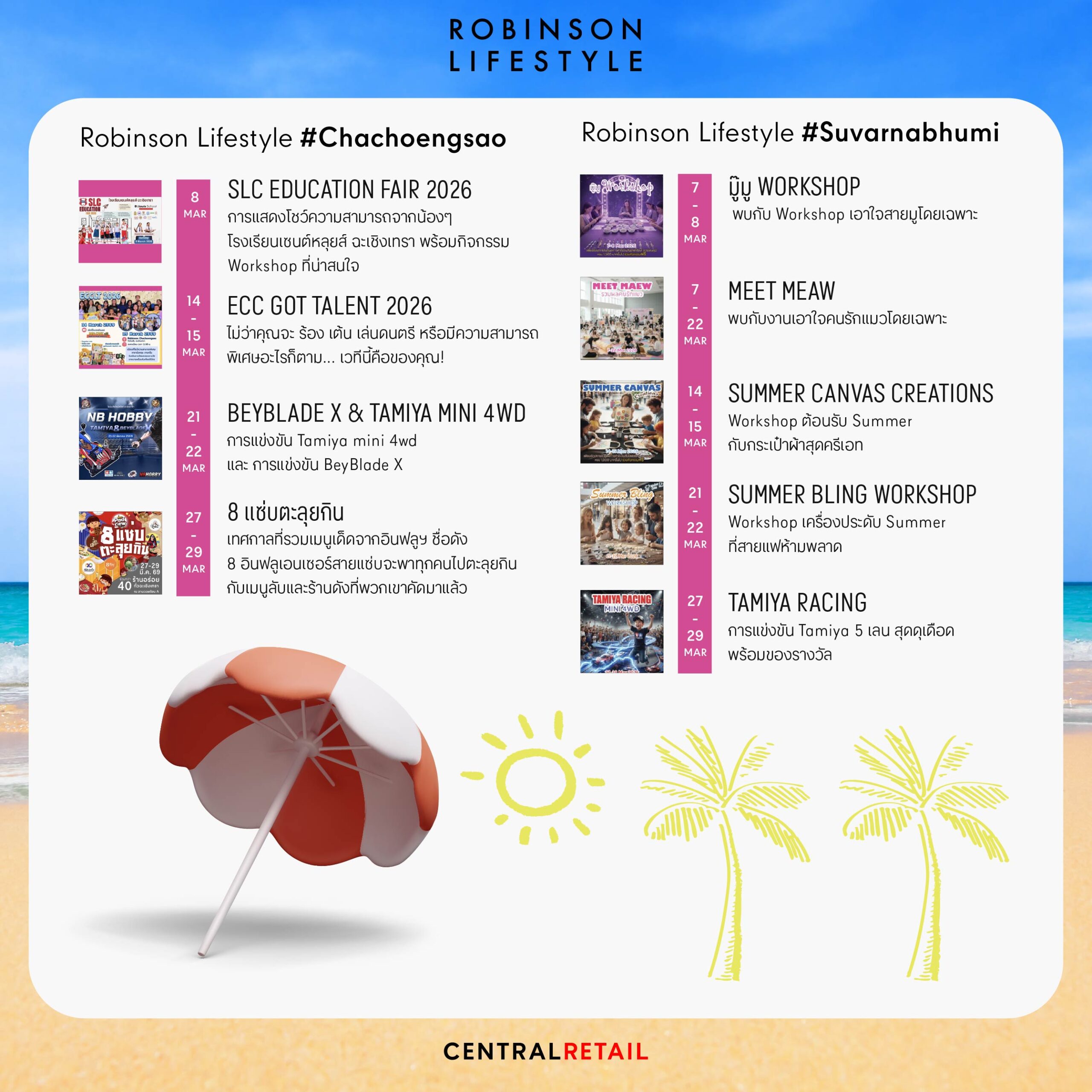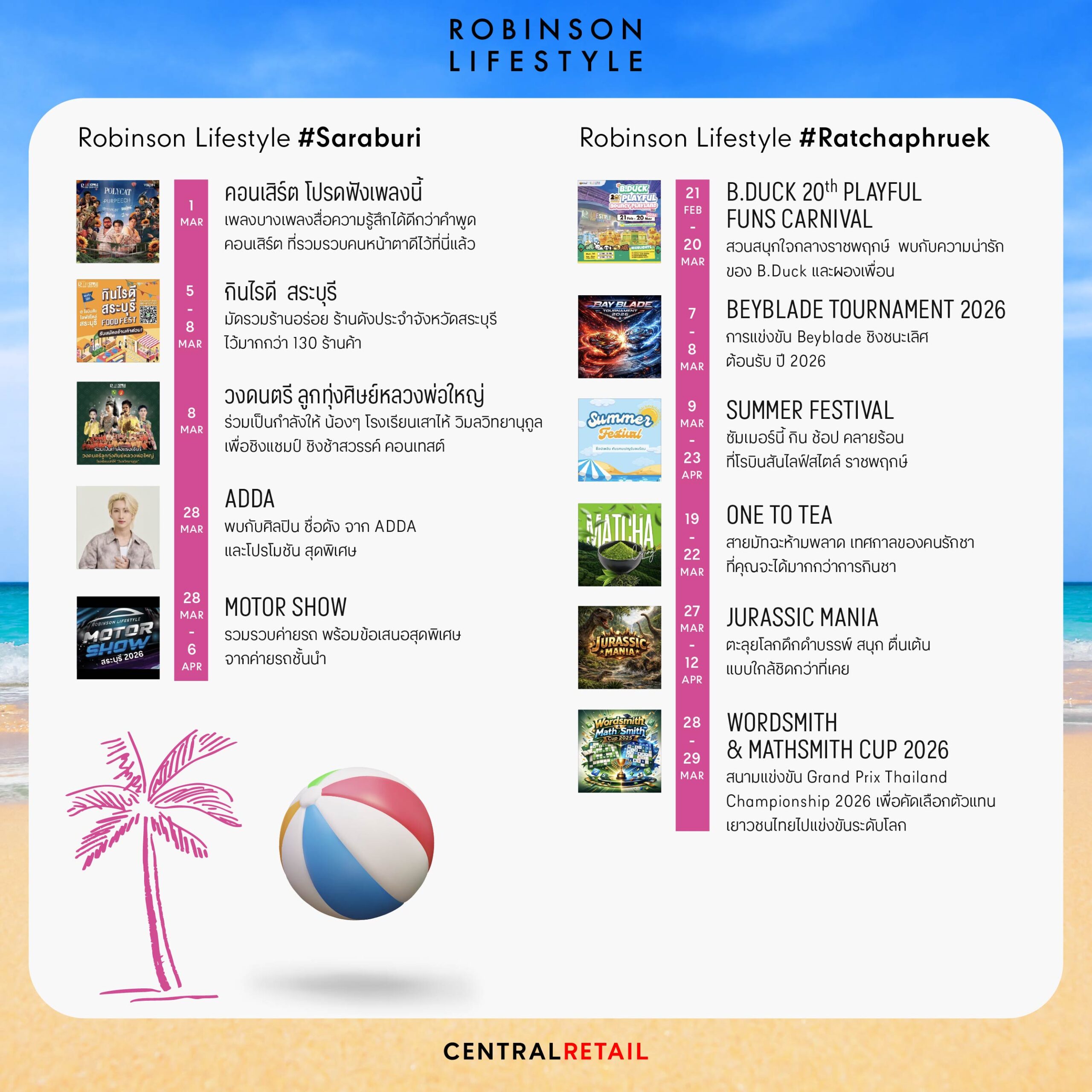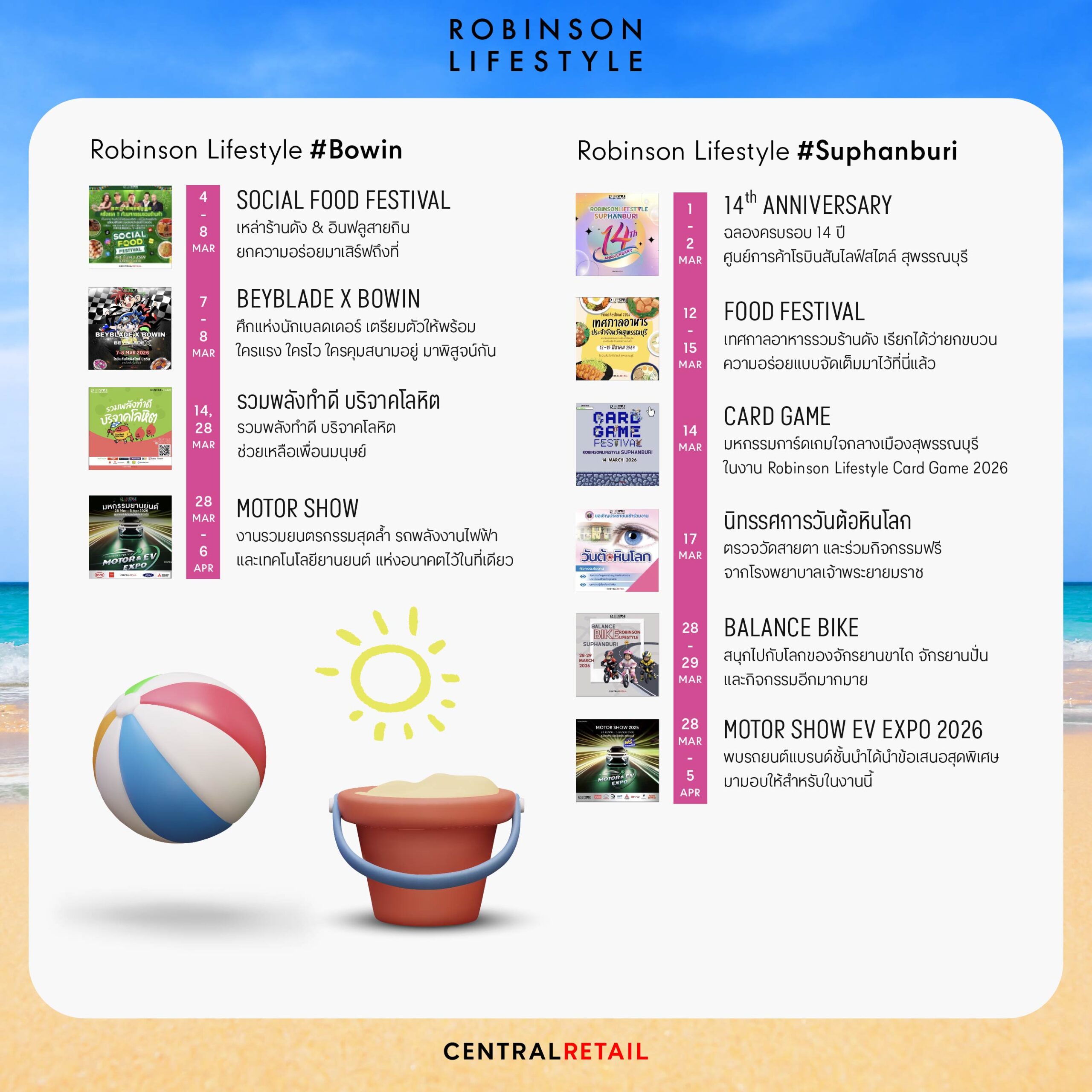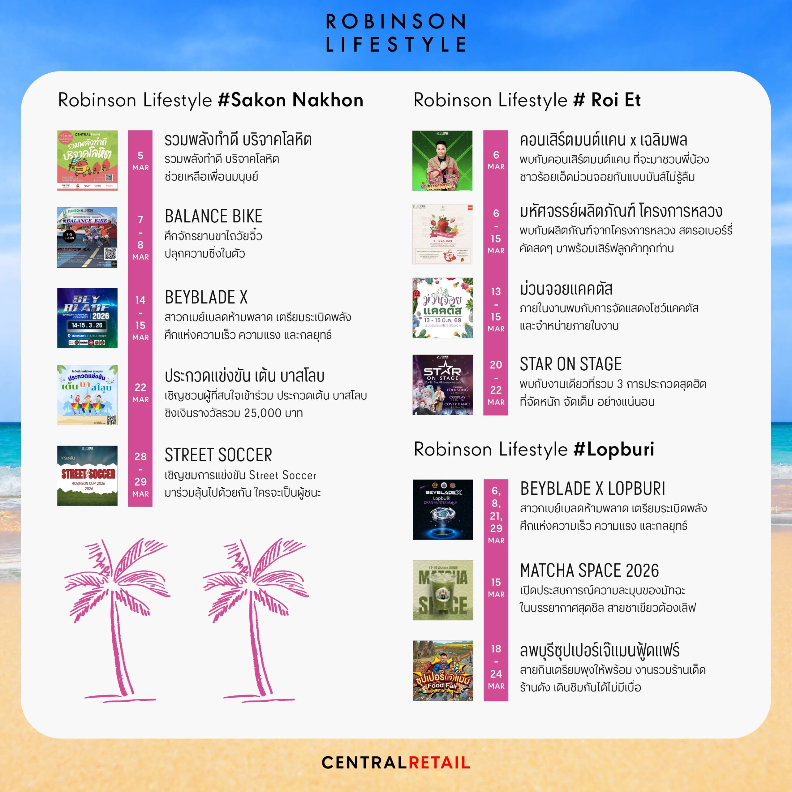 ศูนย์การค้าโรบินสันไลฟ์สไตล์ ในเครือเซ็นทรัล รีเทล ตอกย้ำแนวคิด “Central to Life” หรือศูนย์กลางชีวิตของทุกคน ผ่านกิจกรรมที่จัดขึ้นตลอดเดือนมี.ค. 69 ที่พร้อมปลุกทุกพื้นที่ให้คึกคักรับลมร้อน ด้วยมากกว่า 150 อิเวนต์ ที่โรบินสันไลฟ์สไตล์ ทุกสาขา ทั่วประเทศ ครบทั้งสายกิน สายมันส์ สายแฟ และสายแฟมิลี เติมสีสันความสนุกแบบซัมเมอร์สุดพีค
