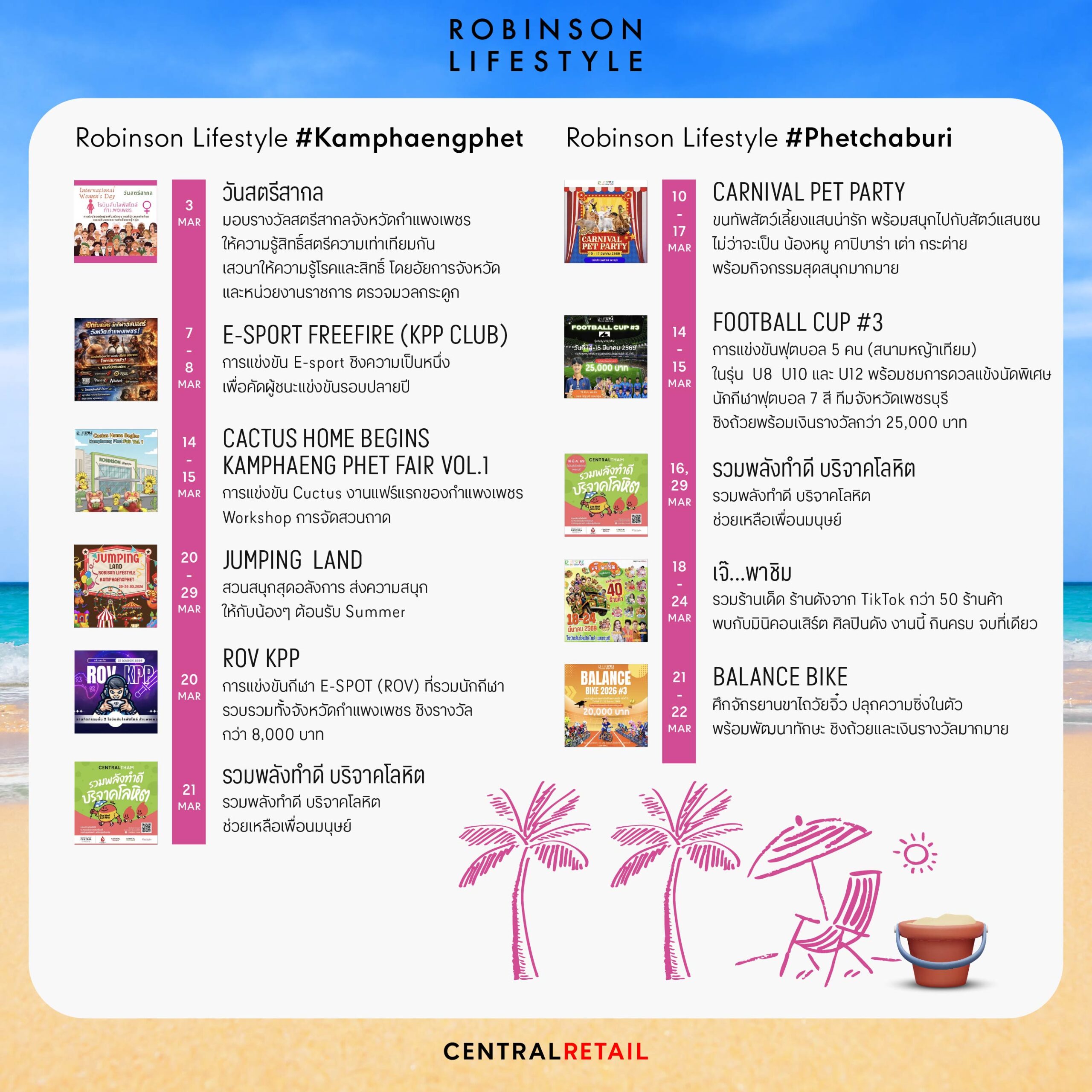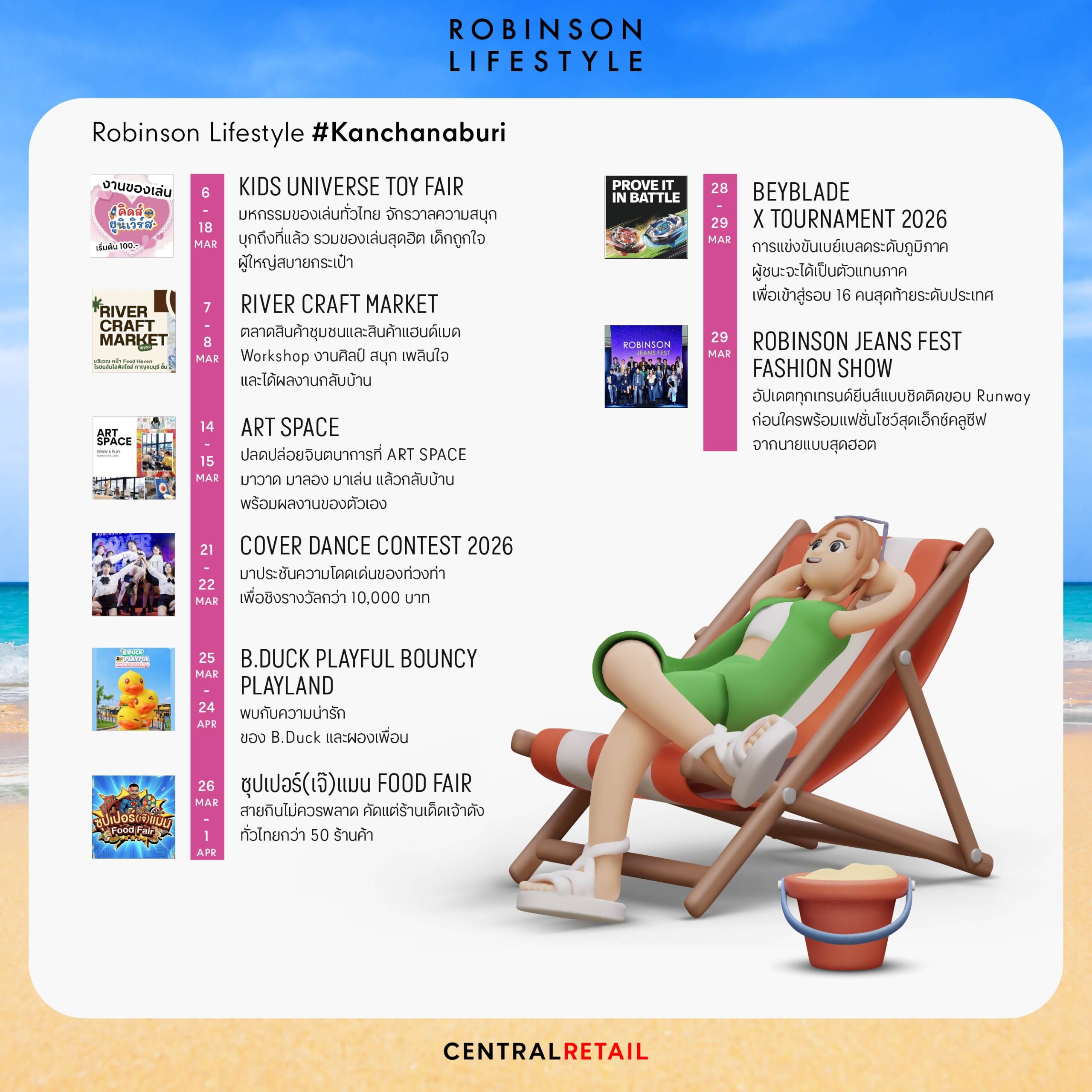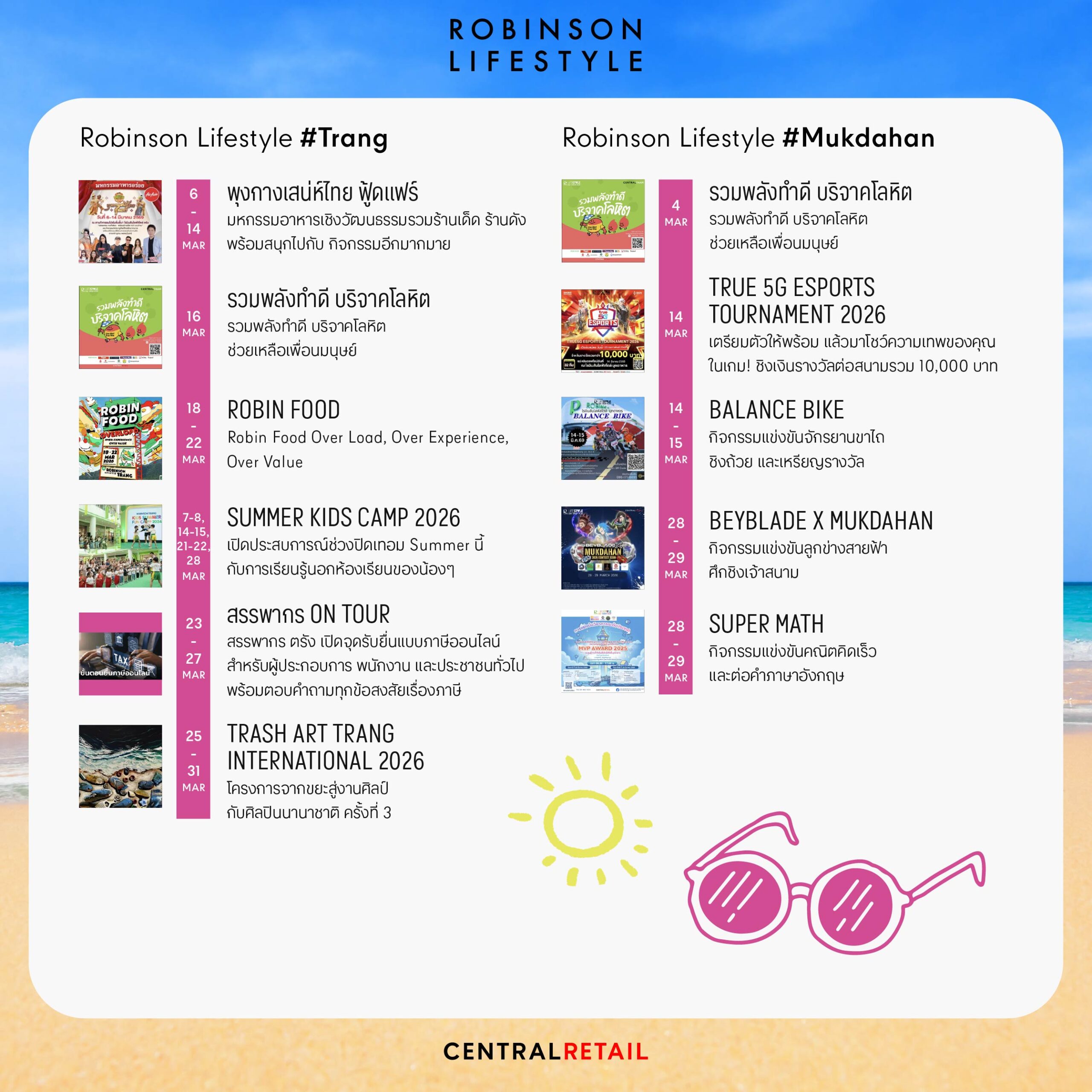 ตลอดเดือนมี.ค. 69 ศูนย์การค้าโรบินสันไลฟ์สไตล์ทั่วประเทศพร้อมสร้างสีสันความสนุก รวมกว่า 150 อิเวนต์ครบทุกไลฟ์สไตล์ ทั้งมหกรรมอาหาร คอนเสิร์ต การแข่งขันกีฬา อีสปอร์ต เวิร์กชอปสร้างสรรค์ งานแฟชั่น โชว์พิเศษสำหรับครอบครัว รวมถึงกิจกรรมเพื่อสังคมที่จัดขึ้นอย่างต่อเนื่องในทุกพื้นที่ ให้ลูกค้าได้สัมผัสประสบการณ์ที่แตกต่างและใกล้ชิดชุมชนมากยิ่งขึ้น