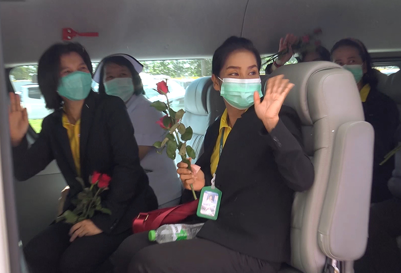 หลังจากนั้นทีมแพทย์ และพยาบาล เดินมายังลานหน้าอาคารผู้ป่วยนอก โดยนายแพทย์ ศราวิน สาครินทร์ รองผู้อำนวยการฝ่ายการแพทย์อาวุโสและผู้บริหารและบุคลากรได้มอบดอกไม้และร่วมให้กำลังใจส่งทีมแพทย์ และพยาบาล ไปปฏิบัติงานโรงพยาบาลสนาม เมืองทองธานี ระหว่างวันที่ 11-25 พฤษภาคม 2564 โดยทีมทั้งหมดประกอบด้วย แพทย์ จำนวน 4 ท่าน พยาบาลวิชาชีพ 5 ท่าน และผู้ช่วยพยาบาล 1 ท่าน ซึ่งบรรยากาศเป็นไปอย่างอบอุ่น