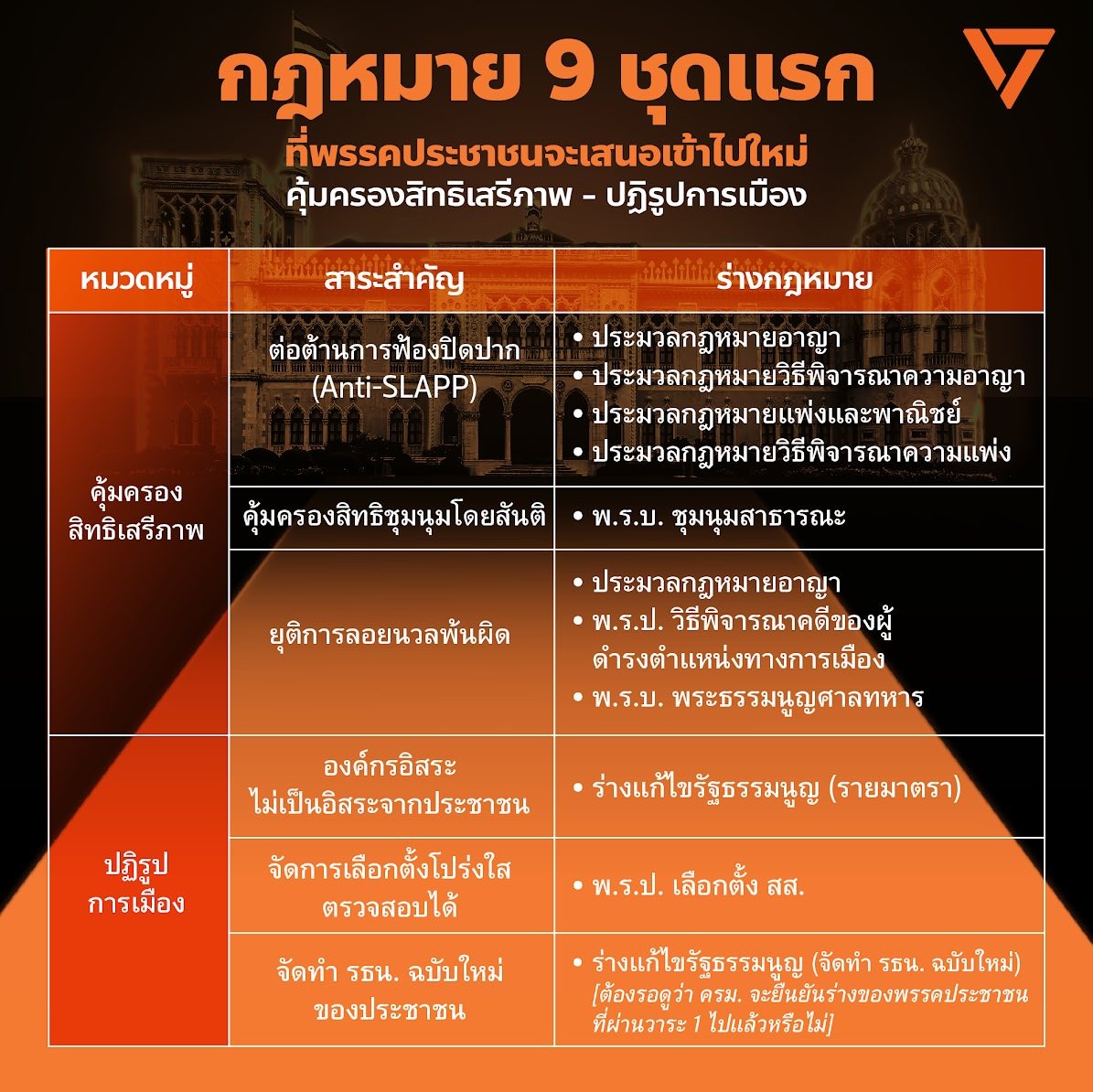 1. กฎหมายที่เราจะเสนอเข้าใหม่ทันทีที่สภาเปิด โดยเบื้องต้นประกอบไปด้วย 9 ชุดแรก