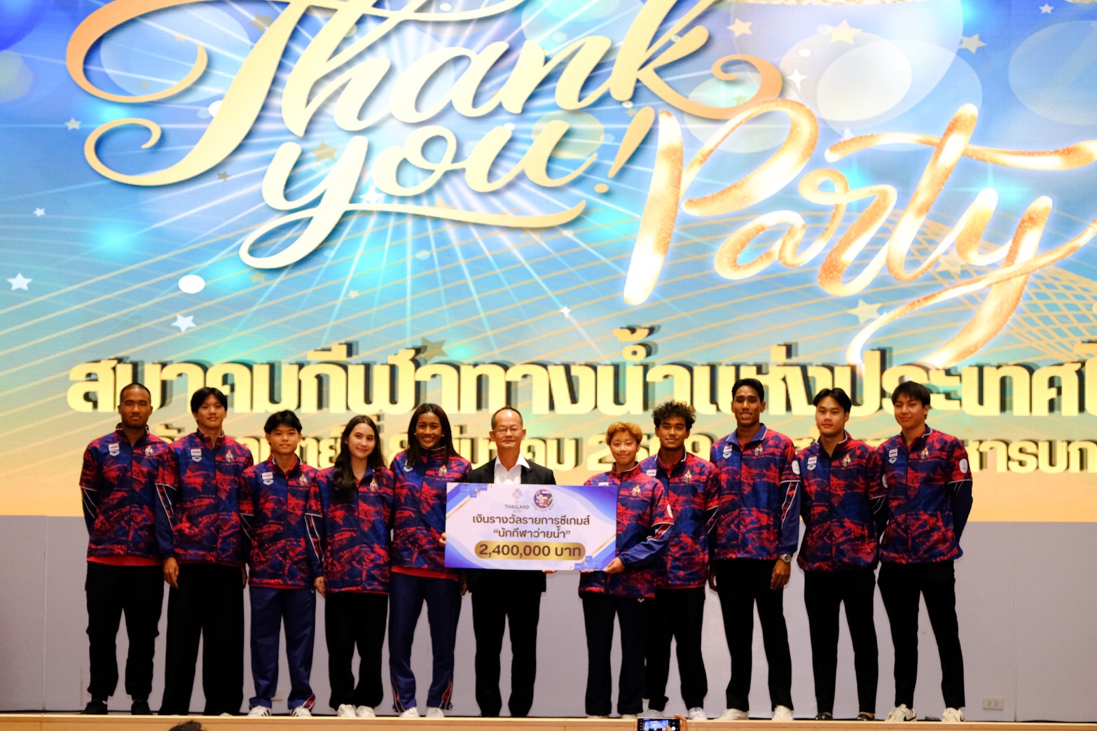 “โค้ชตึก” นายธนาวิชญ์ โถสกุล เลขาธิการสมาคมกีฬาทางน้ำฯ กล่าวว่า เดิมที ร.อ.ธรรมนัสจะมามอบเงินรางวัลให้นักกีฬาด้วยตัวเอง แต่ได้มีการแจ้งมาว่ามีอาการป่วยเล็กน้อย จึงให้มีผู้แทนมอบรางวัลเพื่อตอบแทนความมุ่งมั่นตั้งใจของนักกีฬาในครั้งนี้ ซึ่งถือว่าทำผลงานได้เป็นอย่างดีในทุกกีฬา และเพื่อเป็นกำลังใจให้เดินหน้าฝึกซ้อม ทำผลงานที่ดีให้ทีมชาติต่อไป