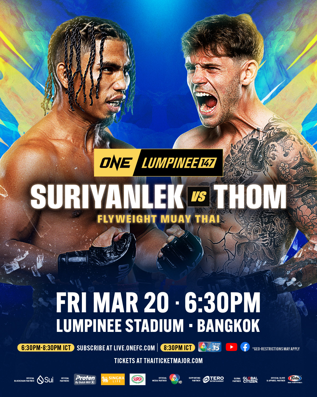 รายการใหญ่ทั้งทีจะขาดชื่อของ “สุริยันต์เล็ก พ.เย็นยิ่ง” ไปไม่ได้ โดยนักชกหมัดดุจากมหาสารคามเตรียมเข้ามาร่วมอัปดีกรีความมันในศึกใหญ่ประจำไตรมาสแรก ONE ลุมพินี 147 ที่ในวันศุกร์ที่ 20 มี.ค. นี้ โดยจะดวลเดือดกับ “เกรเกอร์ ทอม” จอมบู๊จากสกอตแลนด์ ในกติกามวยไทย รุ่นฟลายเวต (125-135 ป.)