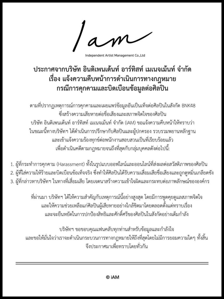 ทางต้นสังกัด Independent Artist Management (อินดิเพนเด้นท์ อาร์ทิสท์ เมเนจเม้นท์) หรือ ค่าย iAM บริษัทผู้ดูแลศิลปินไอดอล BNK48&CGM48 เดือด! แจ้งความเอาผิดผู้ตัดต่อภาพลามกอนาจาร หรือแชร์ข้อความเผยแพร่สังคมบนสื่อออนไลน์ที่ทำเกิดความเสียหายกระทบต่อศิลปิน กล่าวอ้างข้อมูลที่เป็นเท็จทำให้เกิดความเสื่อมเสียและทำให้เข้าใจผิดไปได้ว่าเป็นศิลปินในสังกัด พร้อมเอาผิดผู้คุกคามพื้นที่ส่วนตัว รวมถึงการนำข้อมูลส่วนตัวศิลปินมาเผยแพร่ในพื้นที่สาธารณะ โดยมิได้รับการยินยอมจากตัวศิลปินและทางค่าย โดย “ป๊อปเป้อ-พิณญาดา จึงกาญจนา” ชิไฮนิน BNK48 (ผู้จัดการวง) ได้โพสต์ข้อความระบุว่า