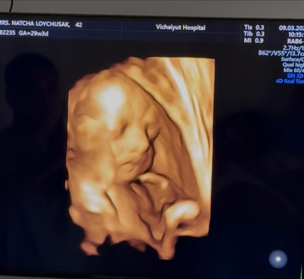 “น้องมีเมตตา ในวัย 29 สัปดาห์ 4 วัน พัฒนาการดีตามเกณฑ์ น้องกลับหัวแล้ว ดูทรงท่าจะขี้อ้อนปะป๊าเหมือนพี่สาวเธอแน่ ๆ ปะป๊าเตรียมใจละลายอีกคูณสอง”