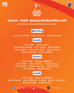 สมาคมกีฬาฟุตบอลแห่งประเทศไทย ในพระบรมราชูปถัมภ์ ประกาศรายชื่อ 30 นักฟุตบอลหญิงทีมชาติไทย รุ่นอายุไม่เกิน 20 ปี เพื่อเก็บตัวฝึกซ้อม เตรียมความพร้อมก่อนทำการแข่งขันฟุตบอลหญิงชิงแชมป์เอเชีย รุ่นอายุไม่เกิน 20 ปี 2026 (AFC U20 Women’s Asian Cup Thailand 2026) ระหว่างวันที่ 1-18 เมษายน 2569 ณ ธรรมศาสตร์ สเตเดียม จังหวัดปทุมธานี ภายใต้การคุมทัพของ “โค้ชหนึ่ง” หนึ่งฤทัย สระทองเวียน หัวหน้าผู้ฝึกสอน