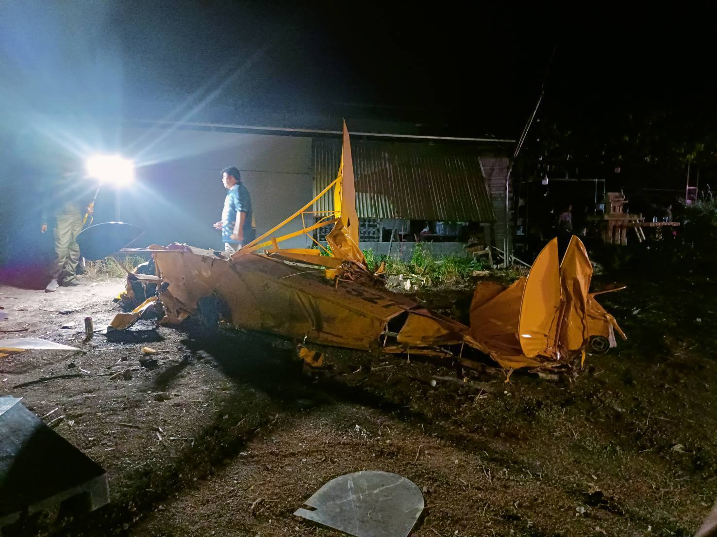 ในที่เกิดเหตุพบเครื่องบินขนาดเล็กสีเหลืองตกอยู่ใต้ต้นมะขาม สภาพปีกหักเสียหายอย่างหนัก ใกล้กันพบสายไฟฟ้าขาด รวมถึงรถจักรยานยนต์ ได้รับความเสียหาย นอกจากนี้ยังพบศาลพระภูมิของบ้านพังเสียหายจากแรงกระแทก