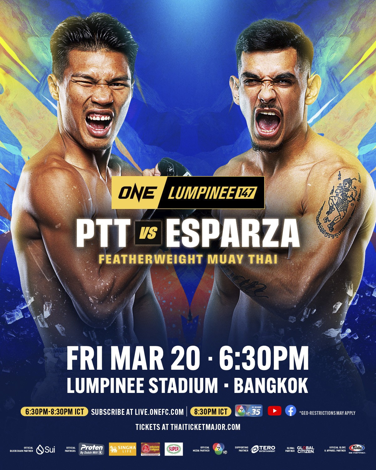 อัปเดตศึกใหญ่ไตรมาสแรกของปี ONE ลุมพินี 147 ที่จะเปิดฉากขึ้นในวันศุกร์ที่ 20 มี.ค. นี้ โดย “ปตท. อภิชาติฟาร์ม” จอมบู๊สู้ไม่ถอย วัย 28 ปี จะเปลี่ยนมาดวลกับ “อาเรียน เอสพาร์ซา” มวยหมัดคม วัย 23 ปี จากสหรัฐอเมริกา ซึ่งอาสาทำหน้าที่แทน “ฮัมซา ราชิด” กำปั้นแกร่ง วัย 26 ปี จากโมร็อกโก ที่มีเหตุสุดวิสัยต้องขอถอนตัวกะทันหัน โดยทั้งคู่จะสู้กันภายใต้กติกามวยไทย รุ่นเฟเธอร์เวต (145-155 ป.)