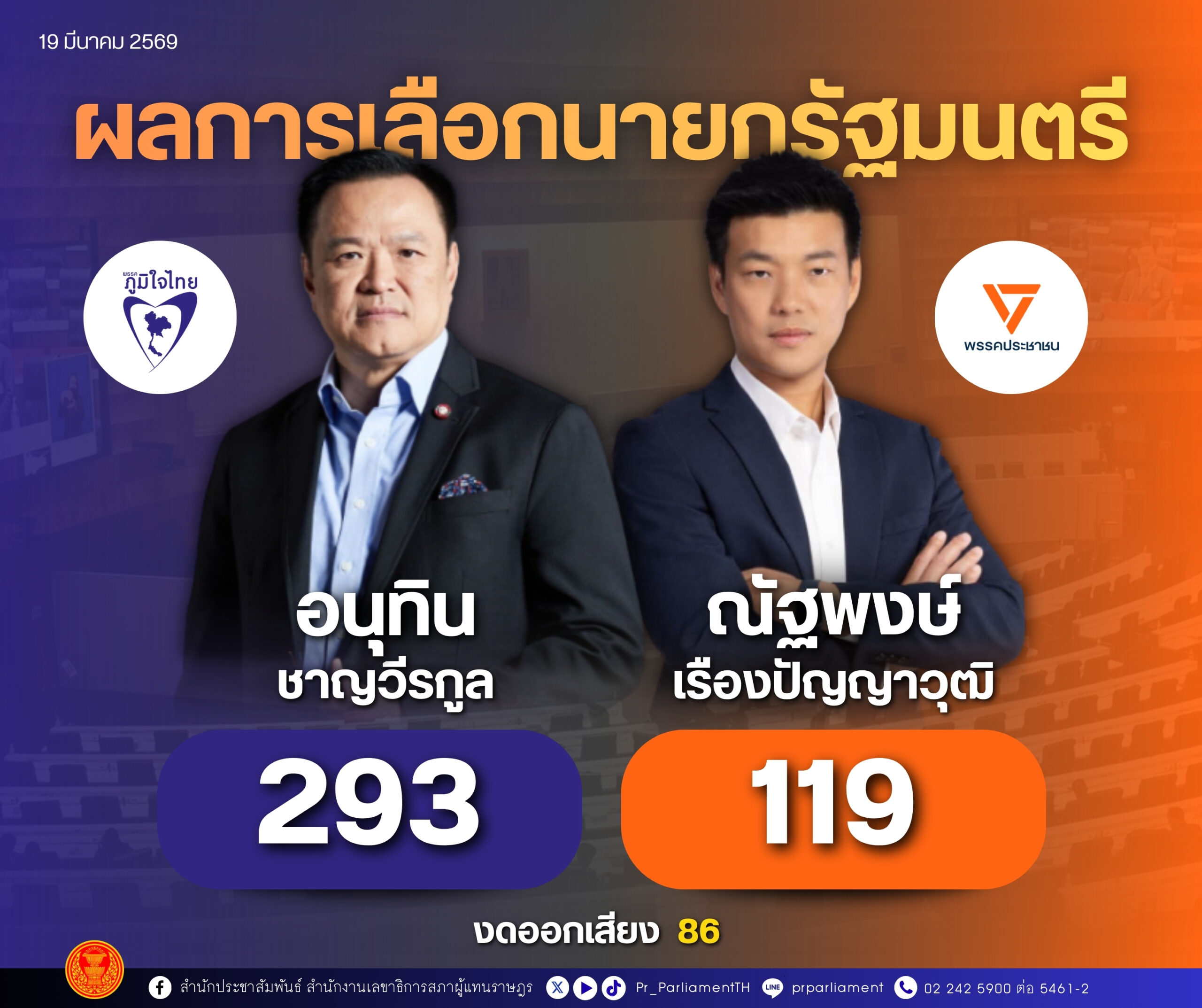 ฉลุย! มติสภา 293:119 โหวต “อนุทิน”นายกฯ สมัย 2 งดออกเสียง 86 ขณะ งูเห่า ปชน. 1 คน