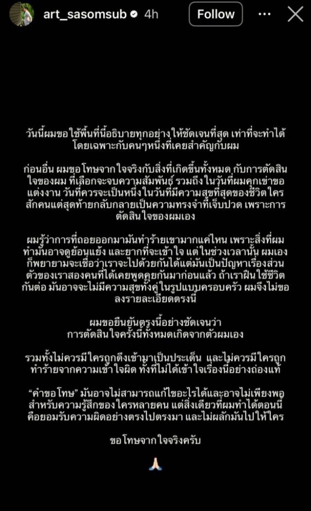 ต่อมาทางด้าน “ไฮโซอาร์ต” เคลื่อนไหวครั้งแรกถึงประเด็นวิวาห์ล่ม โดยโพสต์ข้อความลงไอจีสตอรี่ว่า “วันนี้ผมขอ ใช้พื้นที่นี้อธิบายทุกอย่างให้ชัดเจนที่สุด เท่าที่จะทำได้โดยเฉพาะกับคนๆหนึ่งที่เคยสำคัญกับผม ก่อนอื่นผมขอโทษจากใจจริงกับสิ่งที่เกิดขึ้นทั้งหมด กับการตัดสินใจของผม ที่เลือกจะจบความสัมพันธ์ รวมถึงในวันที่ผมคุกเข่าขอแต่งงาน วันที่ควรจะเป็นหนึ่งในวันที่มีความสุขที่สุดของชีวิตใคร สักคนแต่สุดท้ายกลับกลายเป็นความทรงจำที่เจ็บปวด เพราะการตัดสิน ใจของผมเอง