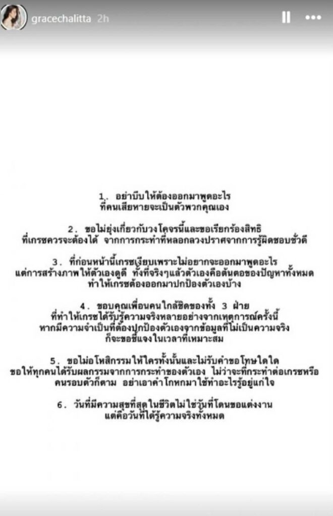 4.ขอบคุณเพื่อนคนใกล้ชิดของทั้ง 3 ฝ่าย ที่ทำให้เกรซได้รับรู้ความจริงหลายอย่างจากเหตุการณ์ครั้งนี้ หากมีความจำเป็นที่ต้องปกป้องตัวเองจากข้อมูลที่ไม่เป็นความจริง ก็จะขอชี้แจงในเวลาที่เหมาะสม