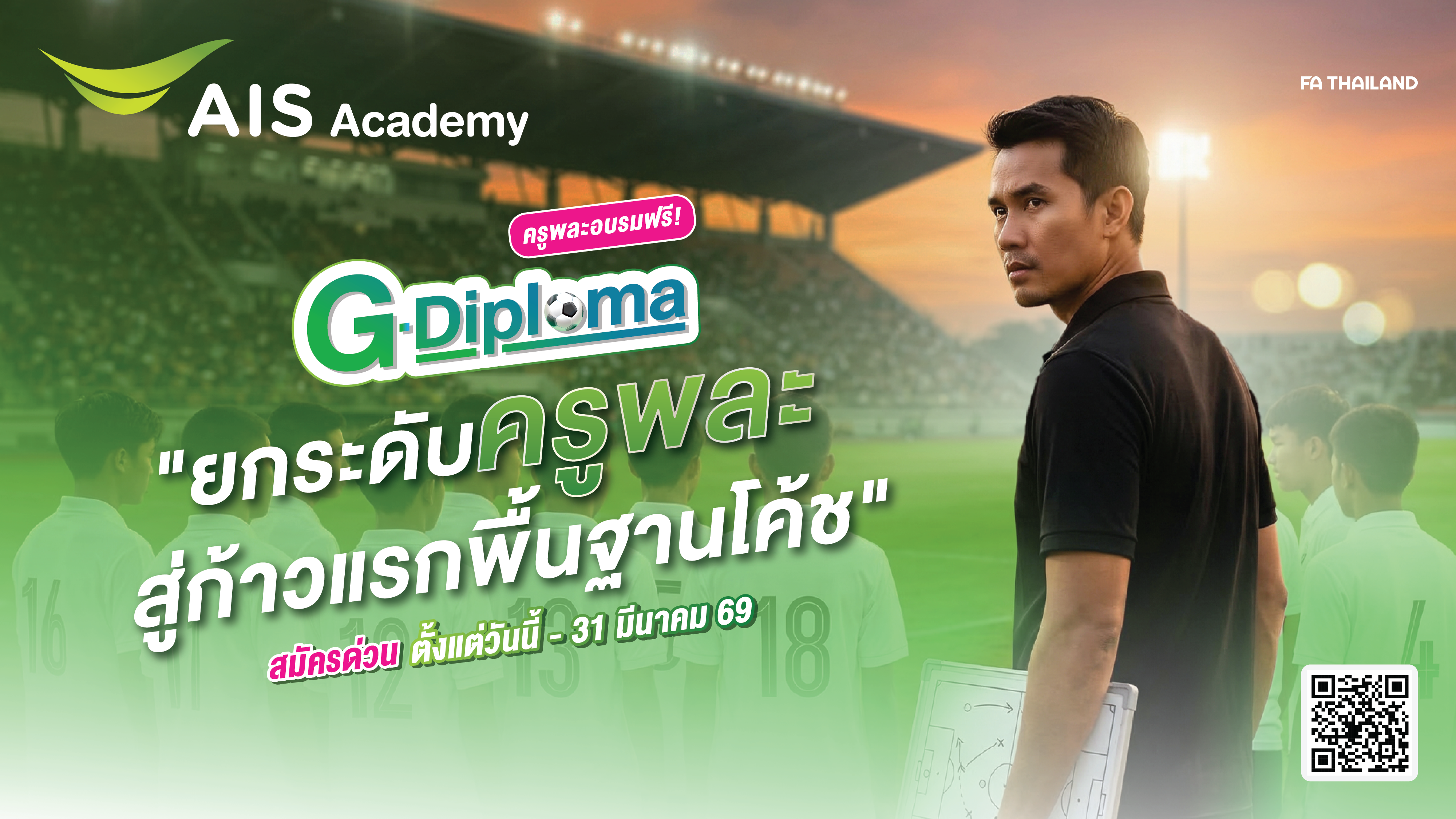AIS Sport Academy ตอกย้ำความมุ่งมั่นในการสนับสนุนวงการฟุตบอลไทย ผนึกกำลัง สมาคมกีฬาฟุตบอลแห่งประเทศไทย ในพระบรมราชูปถัมภ์ ประกาศเปิดรับสมัครครูพลศึกษาจากทั่วประเทศ เข้าร่วมโครงการอบรมผู้ฝึกสอนหลักสูตร “G” Diploma Course ตั้งเป้ายกระดับครูพละ สู่ก้าวแรกพื้นฐานโค้ช ซึ่งเป็นก้าวแรกที่สำคัญที่สุดในการก้าวเข้าสู่เส้นทางโค้ชฟุตบอลมืออาชีพ มุ่งเน้นการปูพื้นฐานการฝึกสอนเยาวชนอย่างถูกวิธี ตามแนวทางมาตรฐานของสหพันธ์ฟุตบอลแห่งเอเชีย (AFC) และสหพันธ์ฟุตบอลนานาชาติ (FIFA)