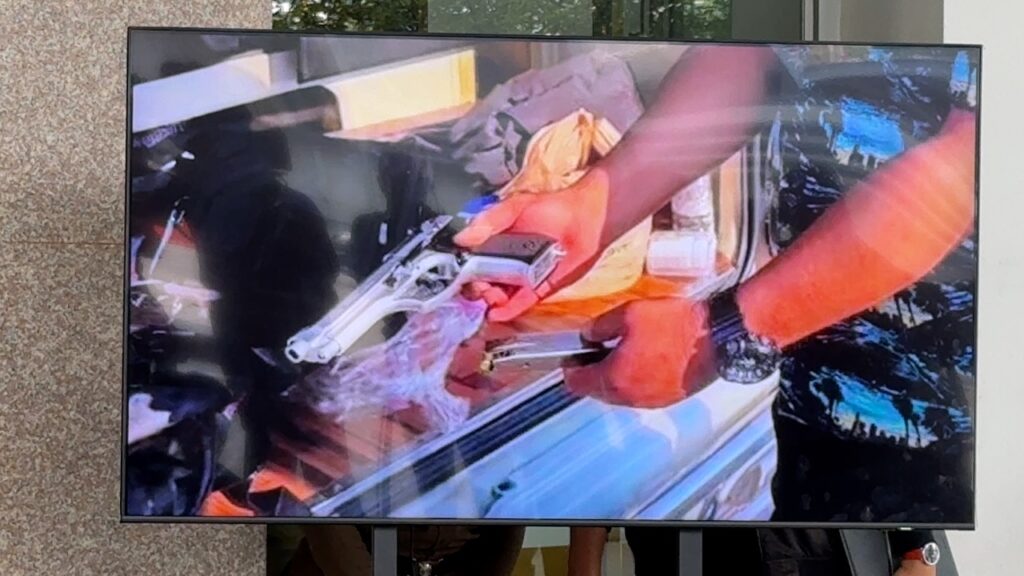 แต่เมื่อตำรวจทางหลวงตรวจสอบในระบบ พบว่าเป็น “บัตรปลอม” จึงทำการจับกุมตัวพร้อมผู้ต้องหาและค้นภายในรถตู้คันดังกล่าว พบอาวุธปืน Sig Sauer P365 สีดำ (ปืนผิดมือ) ขนาด 9 มม. พร้อมแม๊กกาซีน บรรจุกระสุนพร้อมใช้ จำนวน 10 นัด และกระสุนจำนวน 15 นัดเก็บอยู่ในถุงซิปเปิดปิดได้ และพบปืนแบลงค์กัน RETAY MOD92 สีขาว ขนาด 3 มม. บรรจุกระสุนพร้อมใช้จำนวน 2 นัด อีก 1 กระบอก