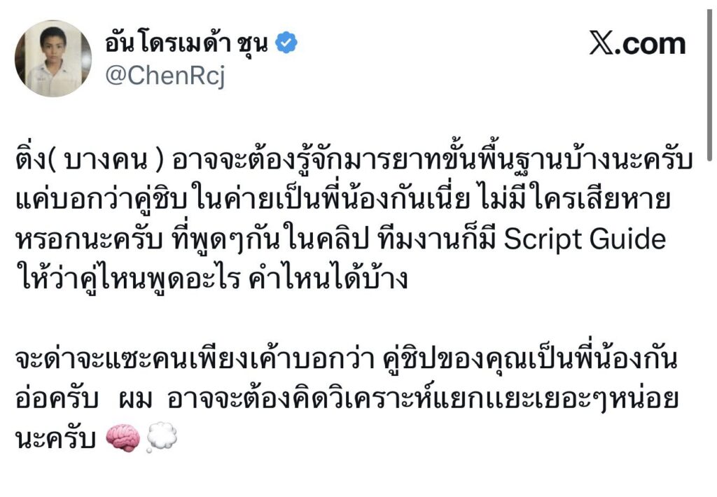 ซึ่งมีชาวเน็ตบางกลุ่มเข้ามาต่อว่า “จุง” ด้วยคำพูดที่ไม่สุภาพ ล่าสุดทางด้าน “จุง อาเชน” ได้ออกมาโพสต์แรงผ่านX ว่า “ติ่ง( บางคน ) อาจจะต้องรู้จักมารยาทขั้นพื้นฐานบ้างนะครับ แค่บอกว่าคู่ชิบในค่ายเป็นพี่น้องกันเนี่ย ไม่มีใครเสียหายหรอกนะครับ ที่พูดๆกันในคลิป ทีมงานก็มี Script Guide ให้ว่าคู่ไหนพูดอะไร คำไหนได้บ้าง จะด่าจะแซะคนเพียงเค้าบอกว่า คู่ชิปของคุณเป็นพี่น้องกัน อ่อครับผม อาจจะต้องคิดวิเคราะห์แยกเเยะเยอะๆหน่อยนะครับ 🧠💭”