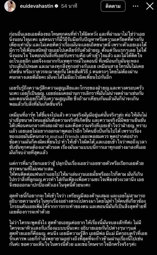 ต่อให้มันไม่น่าเชื่อขนาดไหน แต่มันคือความจริงที่เกิดขึ้น และความจริงนี้มีพยานยืนยันได้ (เพื่อนคนกลางทั้งสองฝ่าย) และคือความจริงที่เอยเข้าใจว่าฝ่ายญ. ทราบแล้ว เอยเลยไม่อยากออกมาพูดอะไรอีกให้คนยิ่งปั่นกันไปได้ เพราะเรื่องของเอยมันมีคนกลาง mutual friends เยอะพอสมควร พูดปากต่อปาก ข้อความมันก็คงผิดเพียนไป ทำให้เข้าใจผิดได้ และเอยเข้าใจว่าพอถึงเวลาขับขันทุกคนต้องเอาตัวรอด เรื่องมันมาแบบบนี้การเอาทุกอย่างมาลงที่เอย มันก็จบง่ายที่สุดแล้ว แต่การที่มาเรียกเอยว่าชู้ ปลุกปั่นเรื่องเอยว่าเอยขายตัวหรือเรียกเอยด้วยสรรพนามที่ไม่เหมาะสม ให้คนติดต่อแฟนเก่าเอยไปให้มาเล่นงานเอยมั้ยหรืออะไรก็ตาม มันก็เกินไปกว่าสิ่งที่ลูกผญ.ควรทำใส่กัน เพียงเพื่อความซะใจเพียงช่วงเวลานึง เอย จึงขอออกมาปกป้องตัวเองในจุดนี้ด้วยนะคะ สุดท้ายนี้ก็อยากจะให้เข้าใจว่า เหรียญมีสองด้านเสมอ และเอยไม่สามารถอธิบายความจริงในทุกเรื่องอย่างตรงไปตรงมาโดยไม่ทำให้คนที่เกี่ยวข้องโกรธแค้นเอยเพิ่มได้จากการกระทำของตน และตอนนี้มันก็เป็นสิ่งสุดท้ายที่เอยต้องการจะทำด้วย ไม่ว่าใครจะพูดยังไง สุดท้ายเอยแค่อยากให้เรื่องนี้มันจบลงสักทีค่ะ ไม่มีใครจะมาหิวแสงกับเรื่องแบบบนี้นะคะ อธิบายเอยกันไปต่างๆนาๆแต่ สุดท้ายเอยก็คือผญ. คนนึง เอยมีความรู้สึก เอยมีพ่อ มีแม่ มีครอบครัวที่เอยรักเคารพ เอยก็กำลังพยายามอย่างถึงที่สุดที่จะก้าวข้ามผ่านเรื่องนี้ไปเช่น กันค่ะ ขอความเห็นใจในตรงนี้ด้วย และขอโทษจากใจอีกครั้งจริงๆค่ะ”