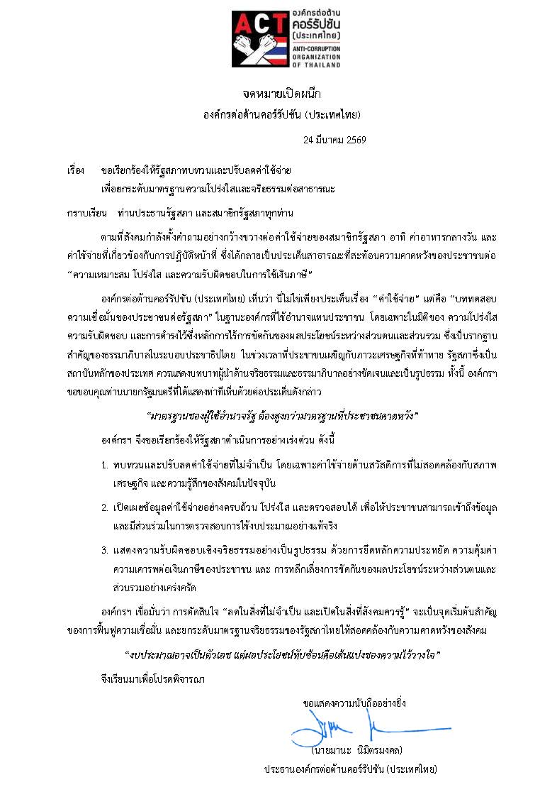 องค์กรต่อต้านคอร์รัปชัน (ประเทศไทย) จดหมายเปิดผนึก ขอเรียกร้องให้รัฐสภาทบทวน และปรับลดค่าใช้จ่ายเพื่อยกระดับมาตรฐานความโปร่งใสและจริยธรรมต่อสาธารณะ