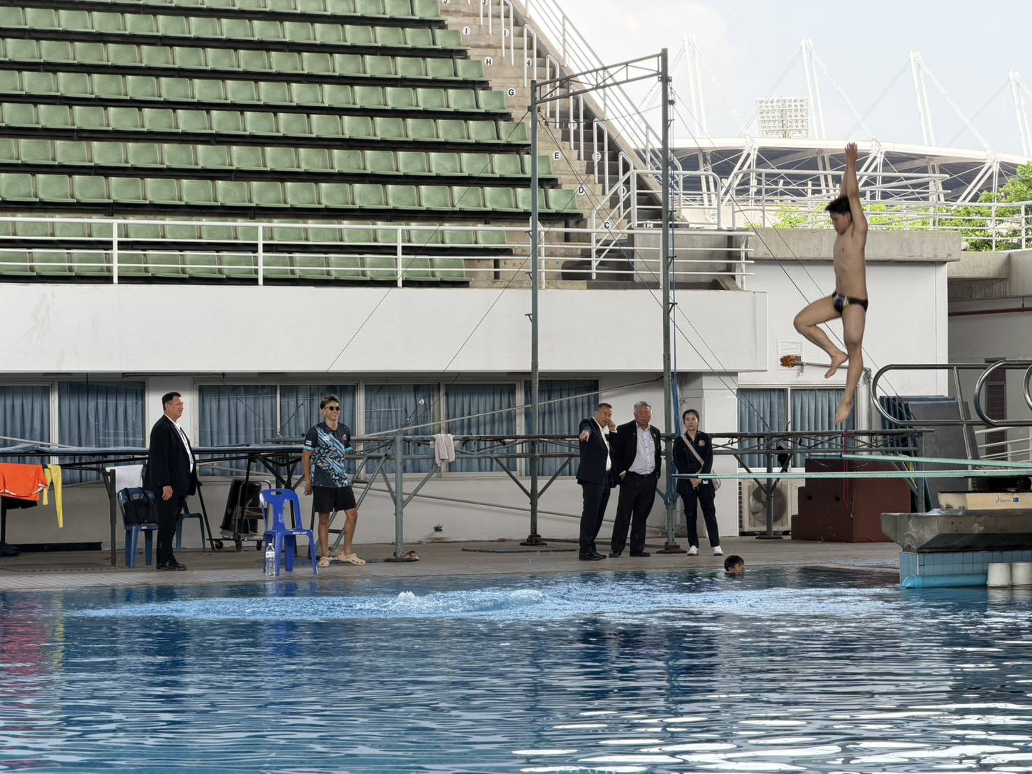 หลังจากเสร็จพิธีลงนามความร่วมมือ พล.ต.ดร. ธนนท์ แสงนาค อุปนายกสมาคมกีฬาทางน้ำแห่งประเทศไทย, “โค้ชตึก“ นายธนาวิชญ์ โถสกุล เลขาธิการสมาคมกีฬาทางน้ำแห่งประเทศไทย และ ผู้ช่วยศาสตราจารย์ มานะ ภู่หลำ ผู้อำนวยการสมาคม ได้เดินทางมาเยี่ยมนักกีฬาเยาวชนที่กำลังฝึกซ้อมรวมทั้งดูความพร้อมของสถานที่ตรวจเช็คสภาพอุปกรณ์และสระให้อยู่ในเกณฑ์มาตรฐาน