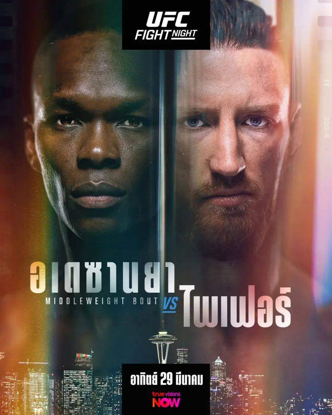 สำหรับการต่อสู้ภายใต้รายการ UFC FIGHT NIGHT : ADESANYA VS PYFER จะระเบิดศึก ณ สังเวียน Climate Pledge Arena, ซีแอตเทิล สหรัฐอเมริกา เช้าวันอาทิตย์ที่ 29 มีนาคมนี้ คู่หลักของรายการเริ่มเวลา 07.00 น. ตามเวลาประเทศไทย