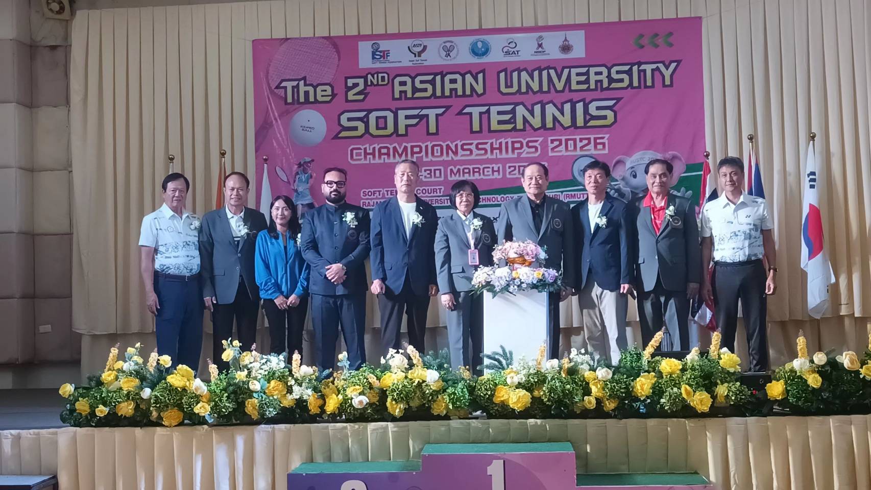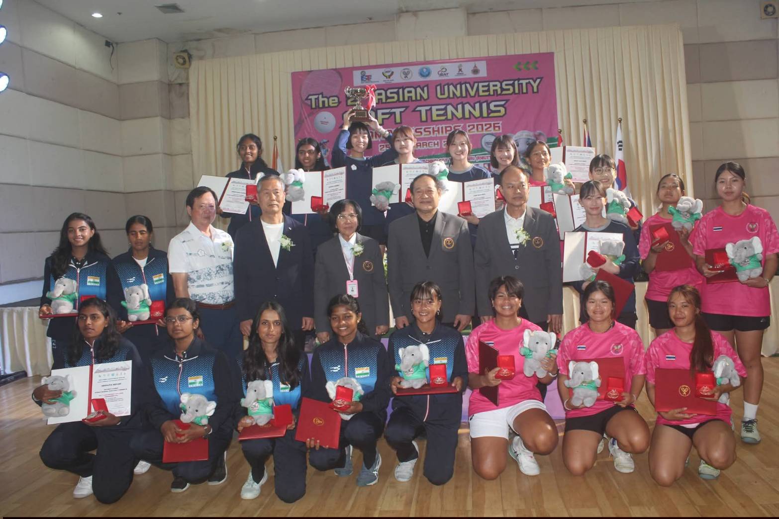 จากนั้นเป็นพิธีมอบเหรียญรางวัลการแข่งขัน “The 2nd Asian University Soft Tennis Championshjps 2026” ที่ ห้องประชุมชั้น 2 อาคารที่พักผู้เข้ารับการฝึกอบรม กรมพลศึกษา โดยได้รับเกียรติจาก รศ.ดร.สมหมาย ผิวสอาด อธิการบดีมหาวิทยาลัยราชภัฏเทคโนโลยีราชมงคลธัญบุรี เป็นประธานในพิธีมอบถ้วยรางวัล , เหรียญรางวัล , เกียรติบัตร และของที่ระลึกแก่นักกีฬาชนะเลิศลำดับต่างๆ ร่วมด้วย นางอุดมลักษณ์ ศิริกุลเลิศรัฐ นายกสมาคมกีฬาซอฟท์เทนนิสแห่งประเทศไทย , นายบรรลือชัย ผิวสานต์ นายกกิตติมศักดิ์สมาคมกีฬาซอฟท์เทนนิสแห่งประเทศไทย , ผู้บริหารสมาคมฯ , มิสเตอร์ ลี ฮยอน แท็ก ผู้แทนสหพันธ์ซอฟท์เทนนิสโลกจากเกาหลีใต้ , มิสเตอร์ หวู หมิง ชาง จากไชนีสไทเป , มิสเตอร์โคดัดฮารา ฮาชาง ผู้ควบคุมทีมซอฟท์เทนนิสอินเดีย ร่วมให้เกียรติมอบรางวัลก่อนถ่ายภาพร่วมกันเป็นอันปิดฉากการแข่งขันซอฟท์เทนนิสชิงชนะเลิศมหาวิทยาลัยแห่งเอเชีย รายการ “The 2nd Asian University Soft Tennis Championships 2026”