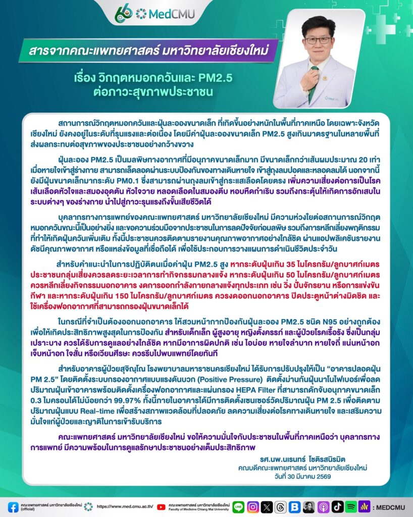 คณะแพทยศาสตร์ มหาวิทยาลัยเชียงใหม่ ออกแถลงการณ์แสดงความห่วงใยต่อสถานการณ์วิกฤตหมอกควันและฝุ่นละอองขนาดเล็ก (PM2.5) ในพื้นที่ภาคเหนือ โดยเฉพาะจังหวัดเชียงใหม่ ที่ยังคงอยู่ในระดับรุนแรงและต่อเนื่อง ส่งผลกระทบต่อสุขภาพประชาชนในวงกว้าง