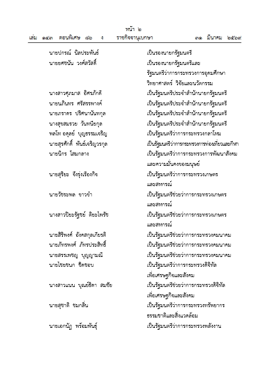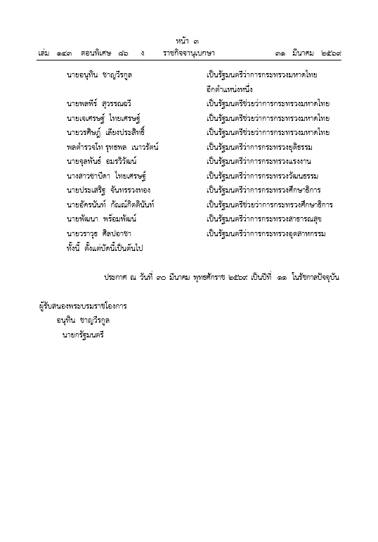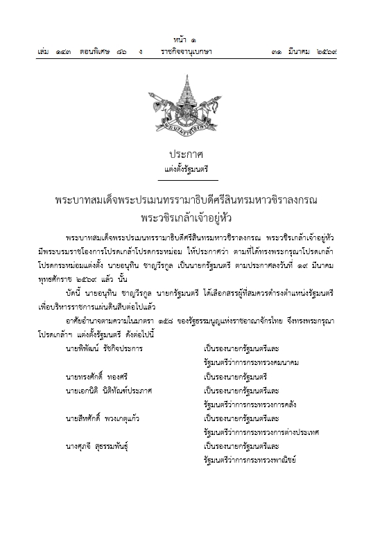 พระบาทสมเด็จพระปรเมนทรรามาธิบดีศรีสินทรมหาวชิราลงกรณ พระวชิรเกล้าเจ้าอยู่หัว มีพระบรมราชโองการโปรดเกล้าฯ ให้ประกาศว่า ตามที่ได้ทรงพระกรุณาโปรดเกล้าโปรดกระหม่อมแต่งตั้ง นายอนุทิน ชาญวีรกูล เป็นนายกรัฐมนตรี ตามประกาศลงวันที่ 19 มีนาคม พุทธศักราช 2569 แล้วนั้น บัดนี้ นายอนุทิน ชาญวีรกูล นายกรัฐมนตรี ได้เลือกผู้ที่สมควรดำรงตำแหน่งรัฐมนตรีเพื่อบริหารราชการแผ่นดินสืบต่อไปแล้ว อาศัยอำนาจตามความในมาตรา 158 ของรัฐธรรมนูญแห่งราชอาณาจักรไทย จึงทรงพระกรุณาโปรดเกล้าฯแต่งตั้งรัฐมนตรีดังต่อไปนี้
