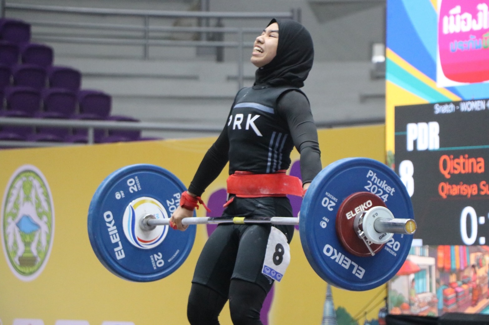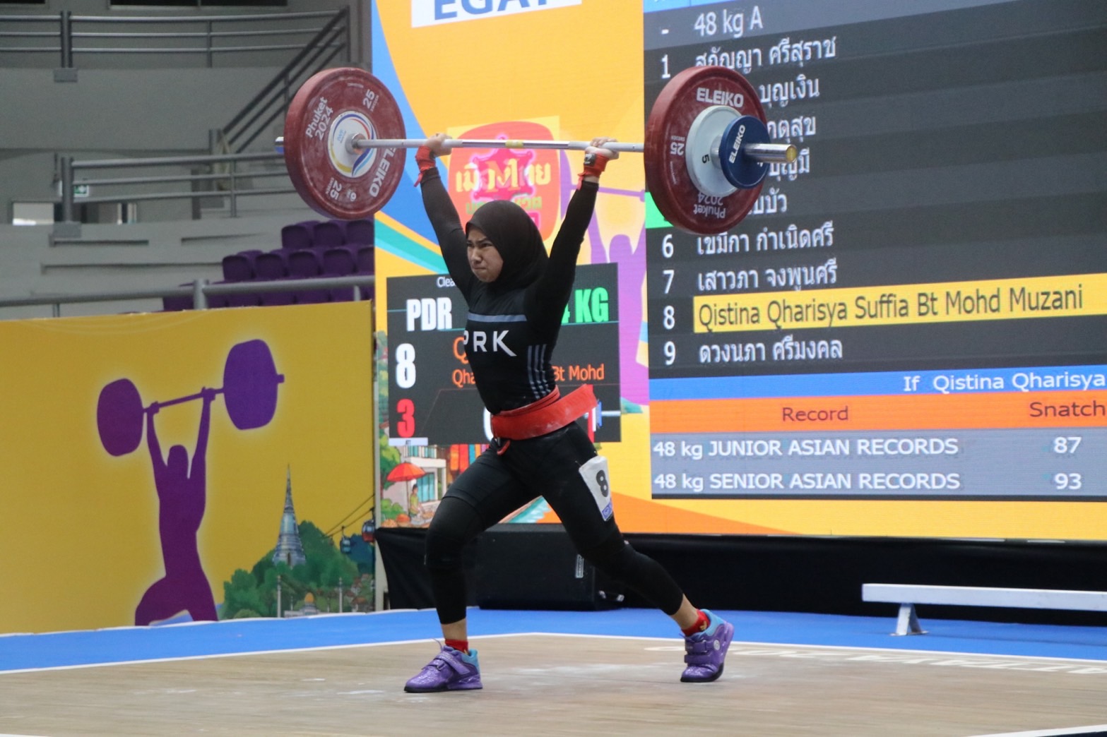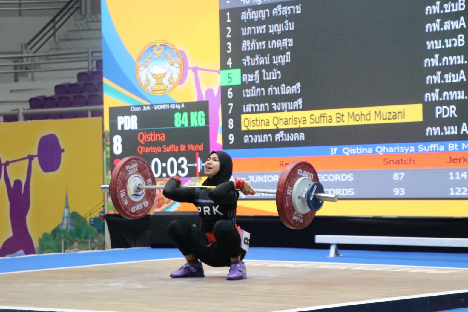 - คิสตินา การิสยา เซอร์เฟีย โมห์ด มูซานี จากสโมสรเปรัก ดารูล ริดซวน แห่งประเทศมาเลเซีย รับ 1 เหรียญเงิน ท่าสแนทช์ 66 กิโลกรัม และ 2 เหรียญทองแดง ท่าคลีนแอนด์เจิร์ก 84 กิโลกรัม, น้ำหนักรวม 150 กิโลกรัม