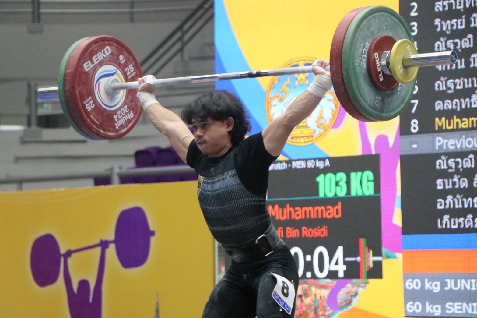 - มูฮัมหมัด ซูฟี บิน โรซิดี จากสโมสรเปรัก ดารูล ริดซวน แห่งประเทศมาเลเซีย รับ 1 เหรียญเงิน ท่าสแนทช์ 105 กิโลกรัม/ ณัฐชนน เชิดฉาย จาก โรงเรียนกีฬาจังหวัดชลบุรี เอ รับ 3 เหรียญทองแดง ท่าสแนทช์ 104 กิโลกรัม, ท่าคลีนแอนด์เจิร์ก 127 กิโลกรัม, น้ำหนักรวม 231 กิโลกรัม