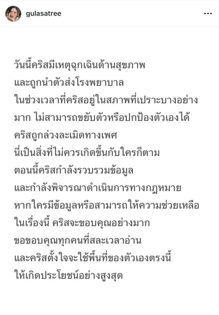 กลายเป็นประเด็นร้อนแรงสะเทือนจิตใจของสังคมไม่น้อย และกำลังเป็นที่พูดถึงมาก ทุกแพลตฟอร์ม สำหรับกรณีของนักแสดง นางแบบ “คริสติน กุลสตรี“ ที่ออกมาเปิดเผยประสบการณ์ถูกล่วงละเมิดทางเพศ โดยโพสต์ข้อความลงไอจีว่า “วันนี้คริสมีเหตุฉุกเฉินด้านสุขภาพ และถูกนําตัวส่งโรงพยาบาล ในช่วงเวลาที่คริสอยู่ในสภาพที่เปราะบางอย่างมาก ไม่สามารถขยับตัวหรือปกป้องตัวเองได้ คริสถูกล่วงละเมิดทางเพศ นี่เป็นสิ่งที่ไม่ควรเกิดขึ้นกับใครก็ตาม ตอนนี้คริสกําลังรวบรวมข้อมูล และกําลังพิจารณาดำเนินการทางกฎหมาย หากใครมีข้อมูลหรือสามารถให้ความช่วยเหลือ ในเรื่องนี้ คริสจะขอบคุณอย่างมาก ขอขอบคุณทุกคนที่สละเวลาอ่าน และคริสตั้งใจจะใช้พื้นที่ของตัวเองตรงนี้ ให้เกิดประโยชน์อย่างสูงสุด”