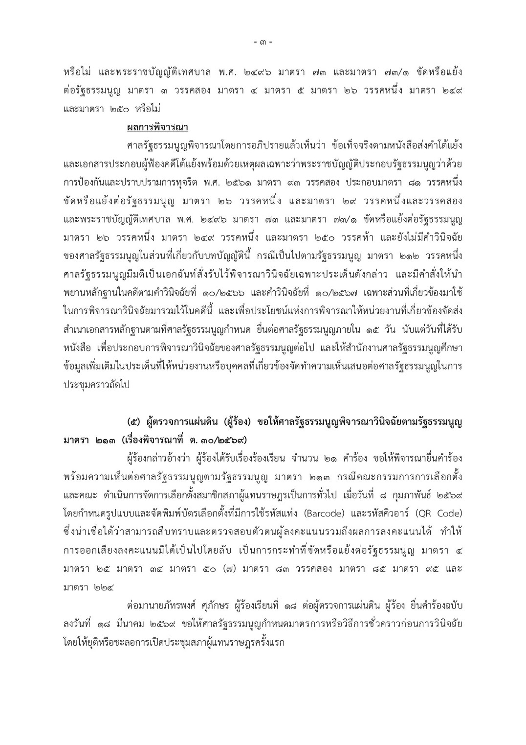 กรณีคณะกรรมการการเลือกตั้ง (กกต.) และคณะ ดำเนินการจัดการเลือกตั้งสมาชิกสภาผู้แทนราษฎร (สส.) เป็นการทั่วไป เมื่อวันที่ 8 ก.พ. 69 โดยกำหนดรูปแบบและจัดพิมพ์บัตรเลือกตั้งที่มีการใช้รหัสแท่ง (Barcode) และรหัสคิวอาร์ (QR Code) ซึ่งน่าเชื่อได้ว่าสามารถสืบทราบและตรวจสอบตัวตนผู้ลงคะแนนรวมถึงผลการลงคะแนนได้ ทำให้การออกเสียงลงคะแนนมิได้เป็นไปโดยลับเป็นการกระทำที่ขัดหรือแย้งต่อรัฐธรรมนูญ มาตรา 4 มาตรา 25 มาตรา 34 มาตรา 50 (7) มาตรา 83 วรรคสอง มาตรา 85 มาตรา 95 และมาตรา 224